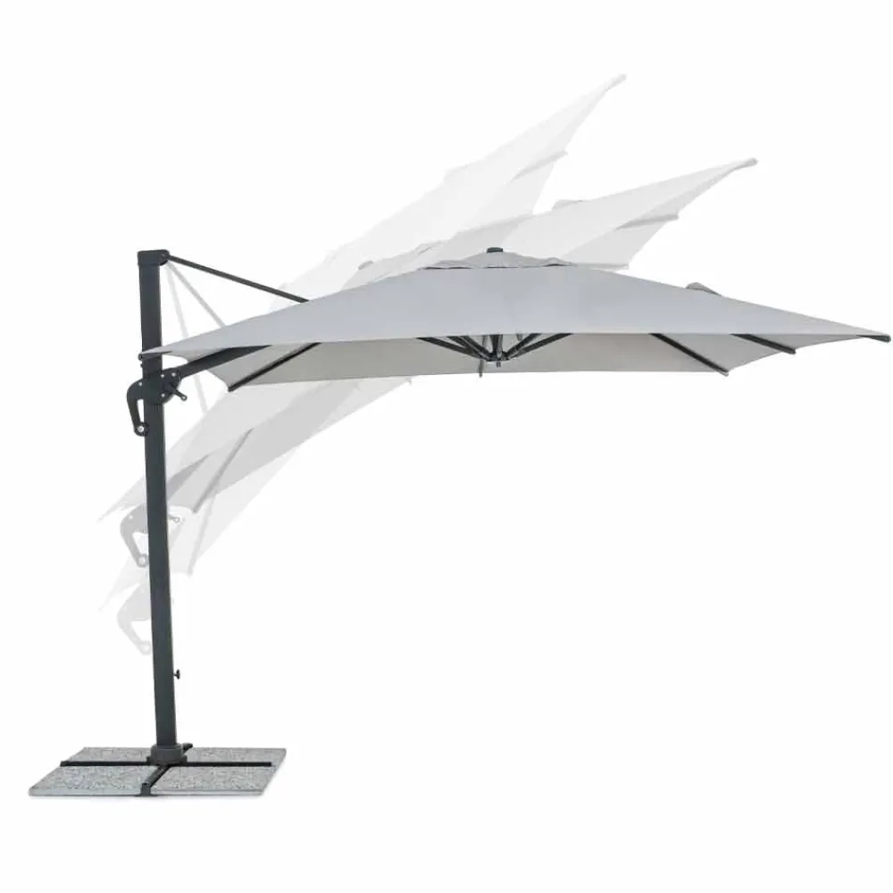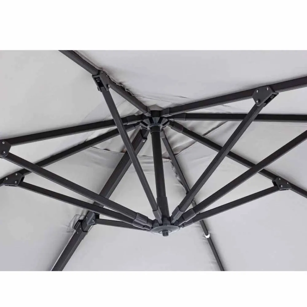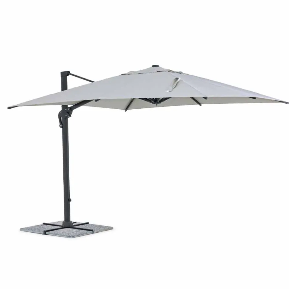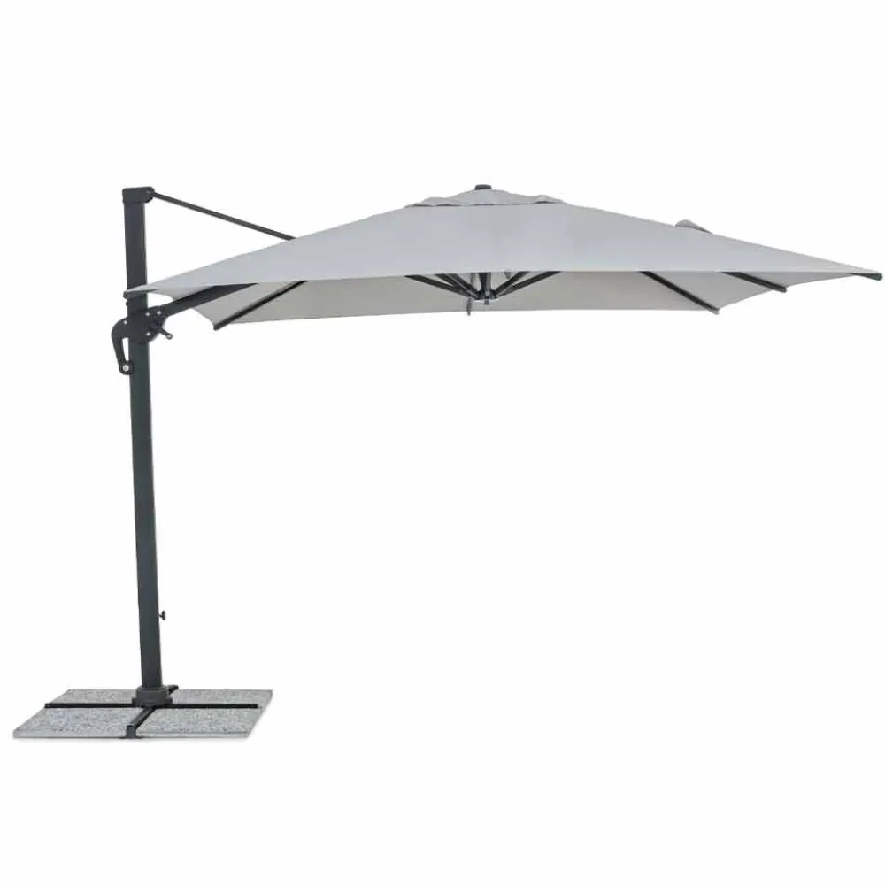 Pulverbeschichtete Aluminiumstruktur (Polyester). 93x57mm Stange. 8 Rippen 28x18mm. Hellgraues Polyestergewebe 250 g / m2 mit Pa (Polyamid) -Beschichtung. Kreuzsockel aus Stahl . 360 ° drehbare Stange mit Pedal. Vertikale Neigung mit 5-Positionen-Griff. Inklusive Regenschirmabdeckung.