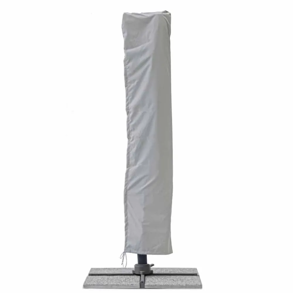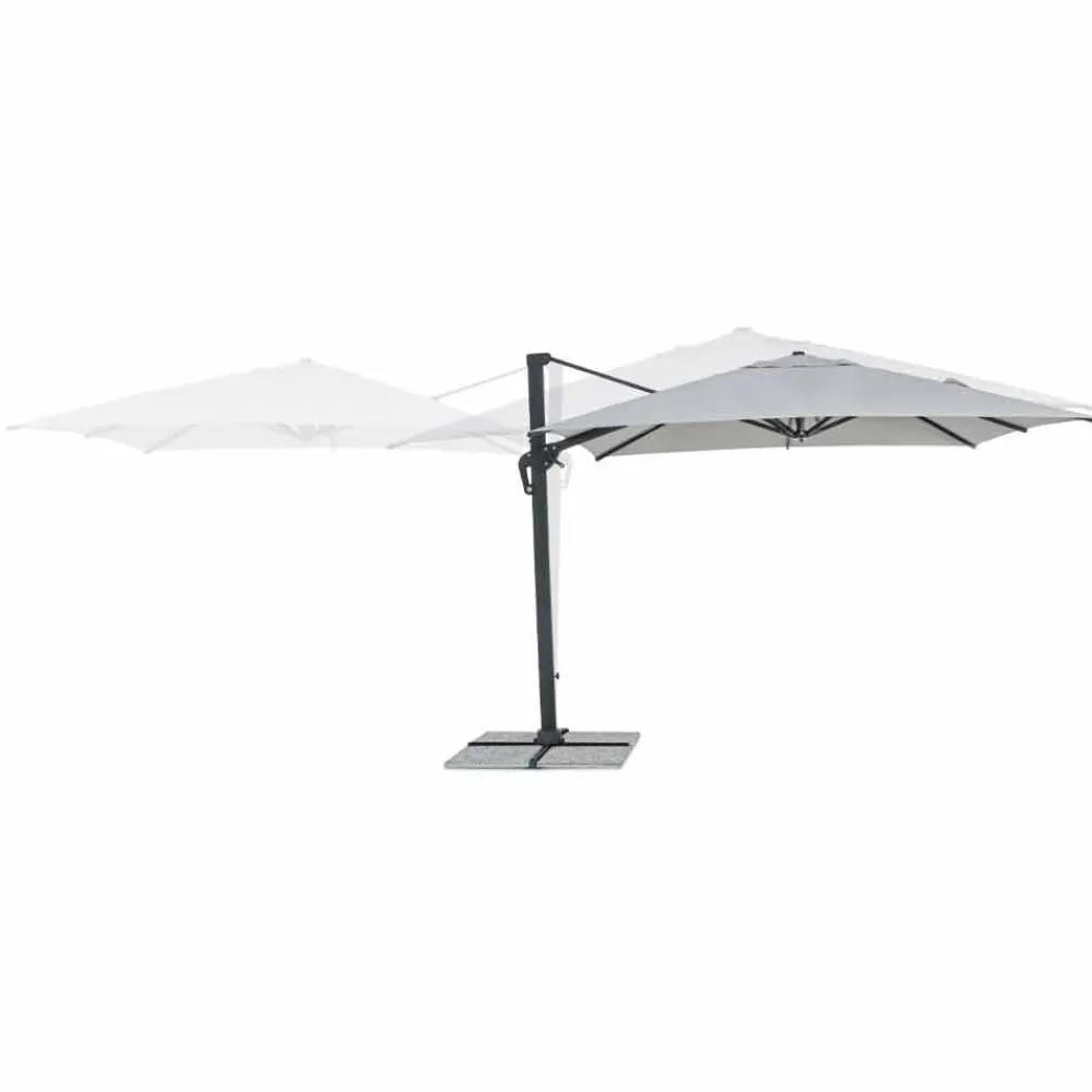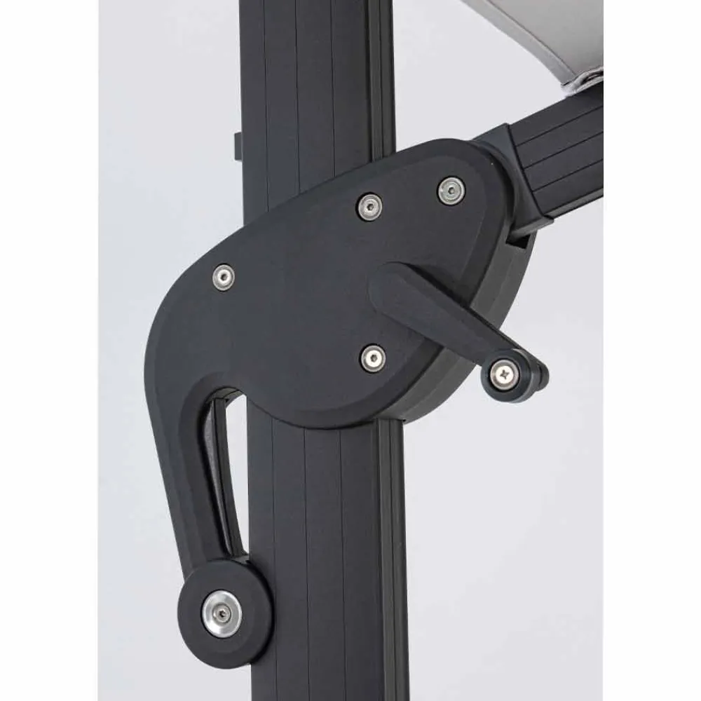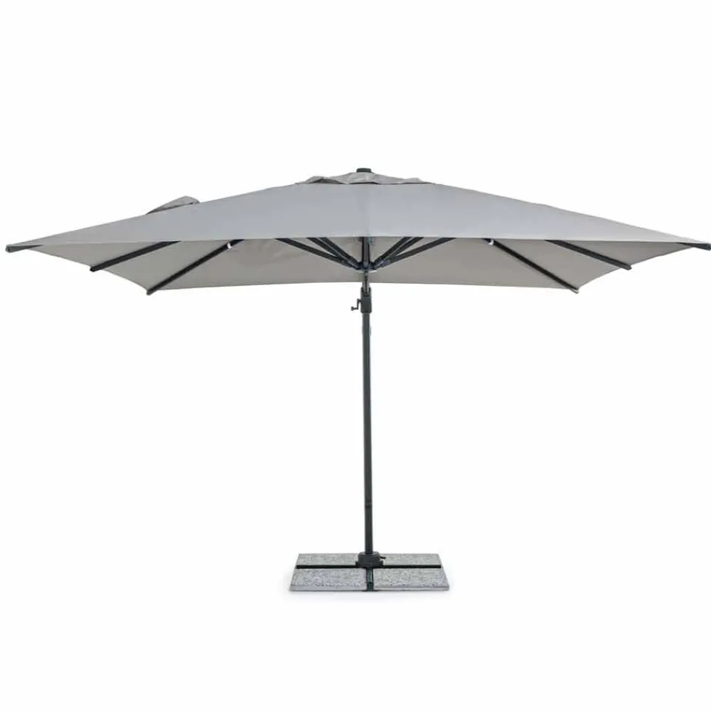 Pulverbeschichtete Aluminiumstruktur (Polyester). 93x57mm Stange. 8 Rippen 28x18mm. Hellgraues Polyestergewebe 250 g / m2 mit Pa (Polyamid) -Beschichtung. Kreuzsockel aus Stahl . 360 ° drehbare Stange mit Pedal. Vertikale Neigung mit 5-Positionen-Griff. Inklusive Regenschirmabdeckung.