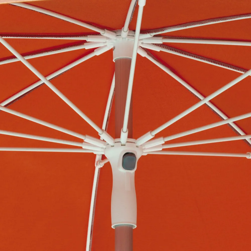 Außenschirm mit 35/40 mm gerippter Struktur aus eloxiertem Aluminium , komplett mit verschraubbarer Verlängerung mit 10 8 mm Glasfaserstäben bei einer maximalen Höhe von 2,46 m und Bezug aus 190 g Olefingewebe mit hohem UV-Schutz.