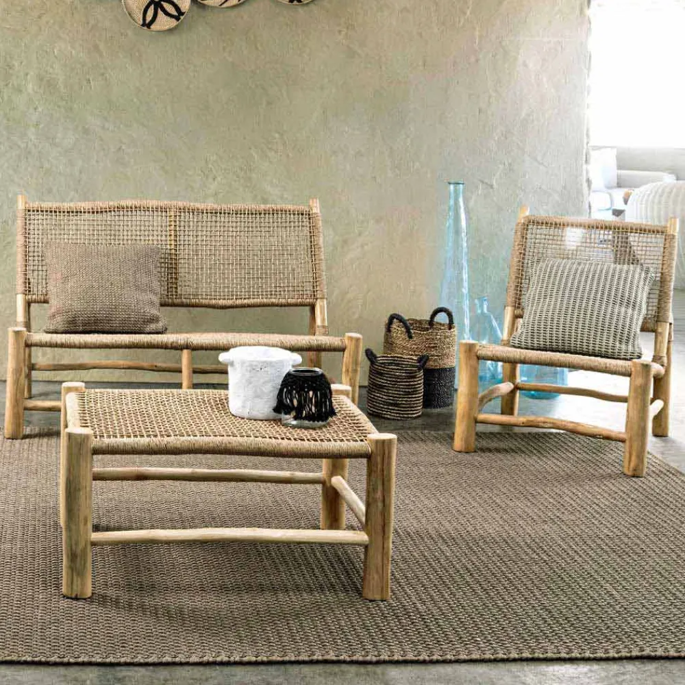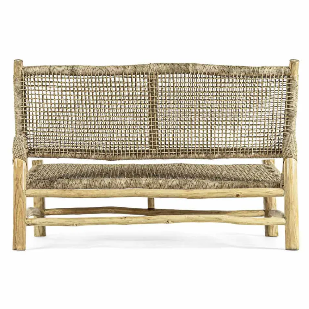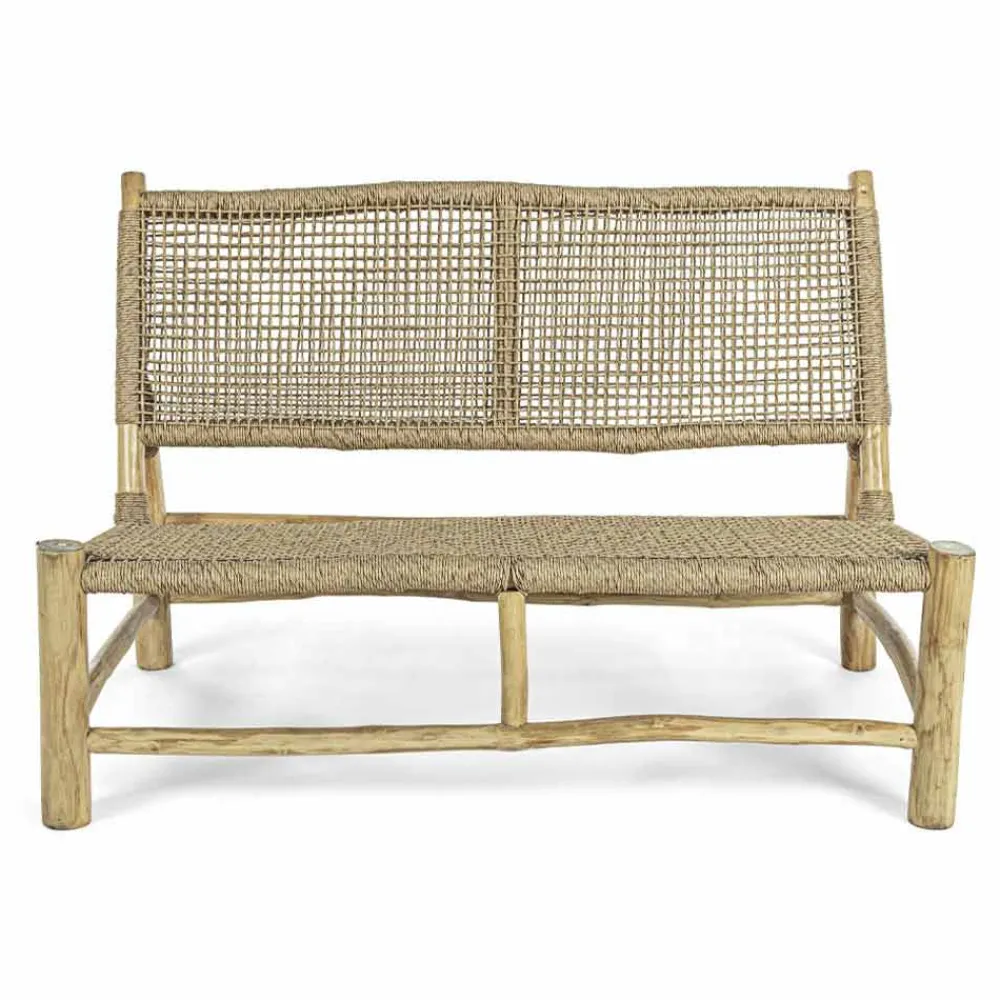 2-Sitzer-Outdoor-Sofa in Teakholzzweigen mit Sitz und Rückenlehne aus Faser.