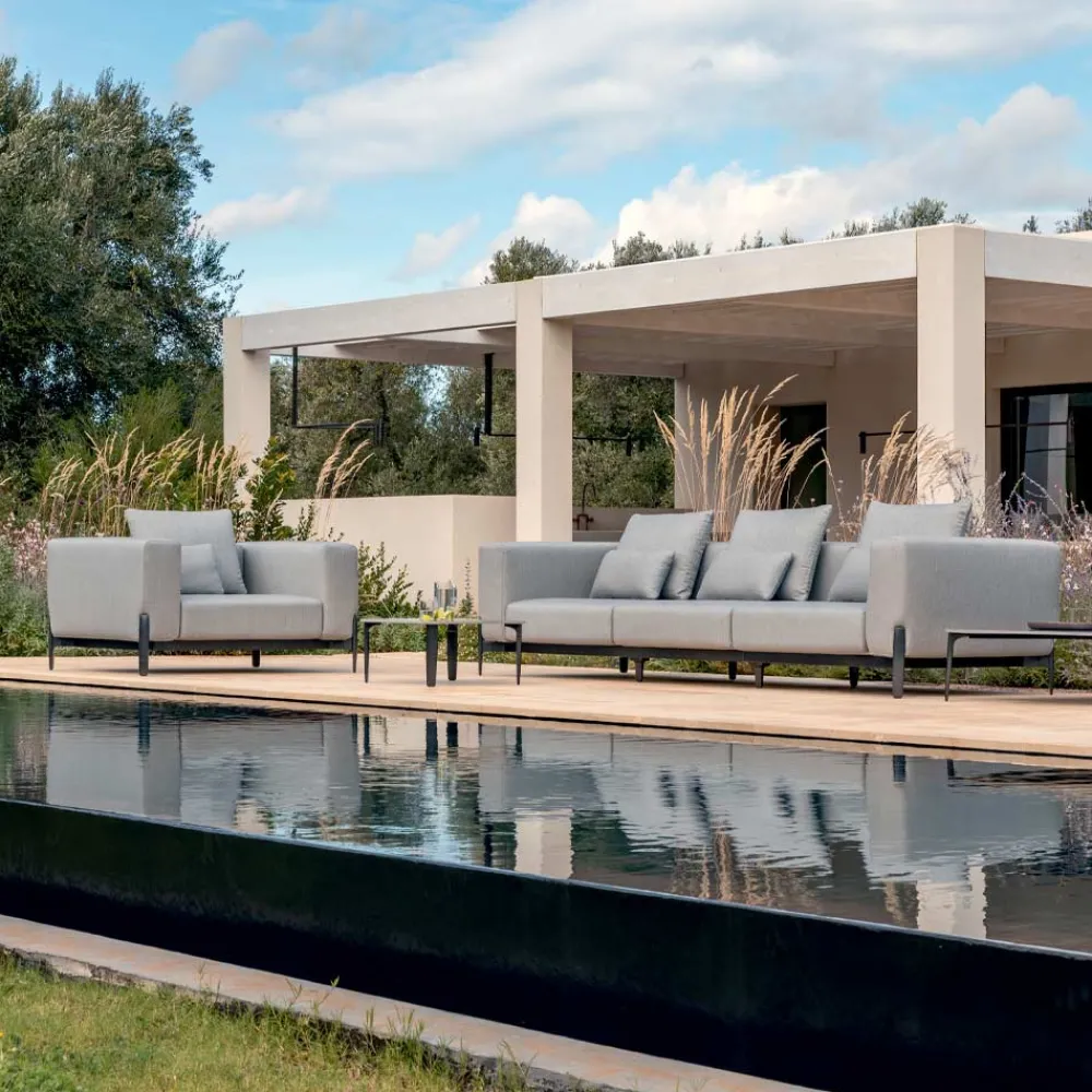 Die Kollektion zeichnet sich durch das Detail des Aluminiumbeins als Mittelpunkt aus, kombiniert mit der formalen und modularen Strenge der Polsterung, um die Natur in Bezug auf maximale Entspannung und Geselligkeit zu erleben, auf dem Sofa sitzend, um einen Tisch herum oder auf dem Tisch liegend Sonnenbank. .