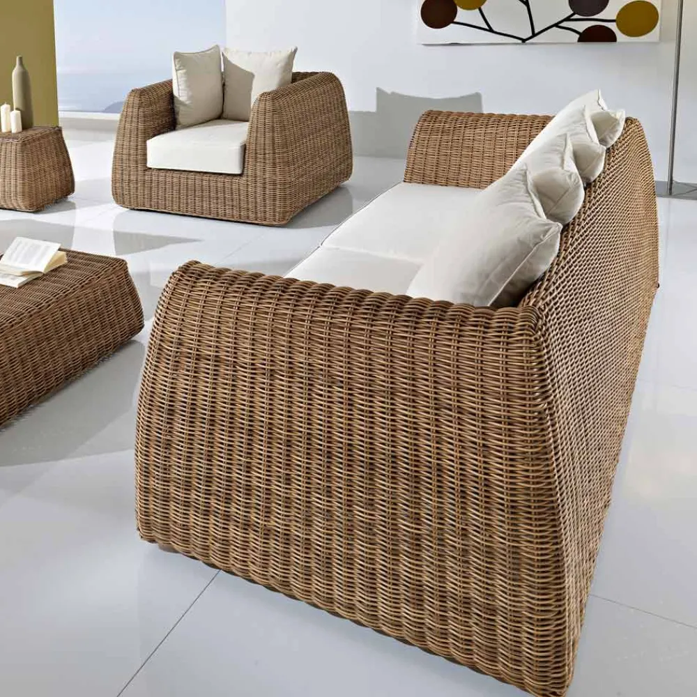 Das raffinierte Design, die sehr hohe Qualität der Materialien, seine geschwungenen und wichtigen Formen, machen ihn perfekt für die Innen- und Außeneinrichtung. Dank der Verwendung spezieller hochwertiger Materialien, hat dieses Outdoor-Sofa dank der Zertifizierung der gewebten Faser keine Angst vor schlechtem Wetter und Temperaturschwankungen.