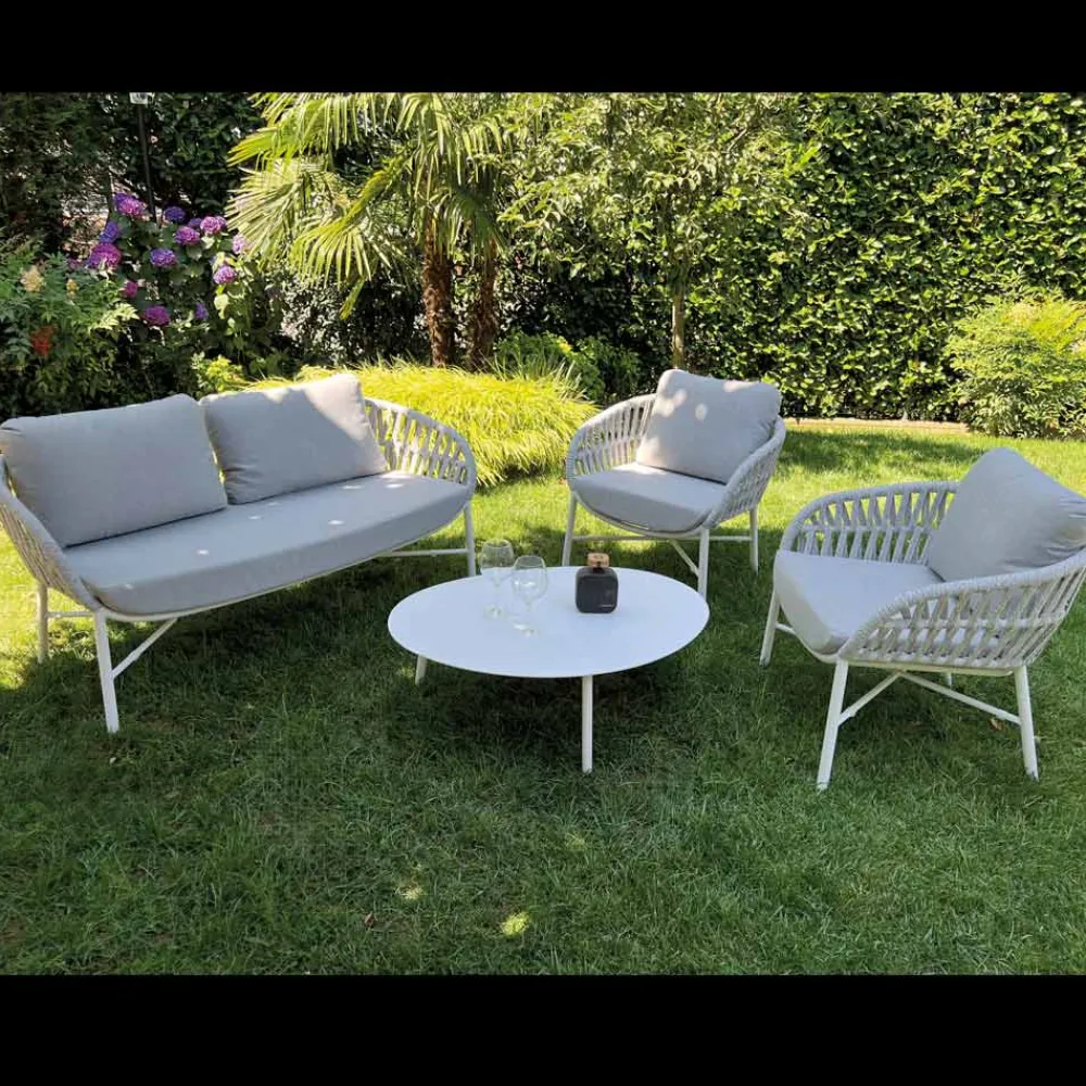 Dieses Gartensofa ist ein perfektes Beispiel für einladendes Design und handwerkliche Raffinesse und eignet sich ideal für die Gestaltung einer Lounge-Ecke zum Entspannen und für Stil . Die lackierte Aluminiumstruktur , leicht, aber widerstandsfähig, trägt elegant ein raffiniertes Gewebe aus Polyesterseil , das dem Sitz Bewegung und Persönlichkeit verleiht.