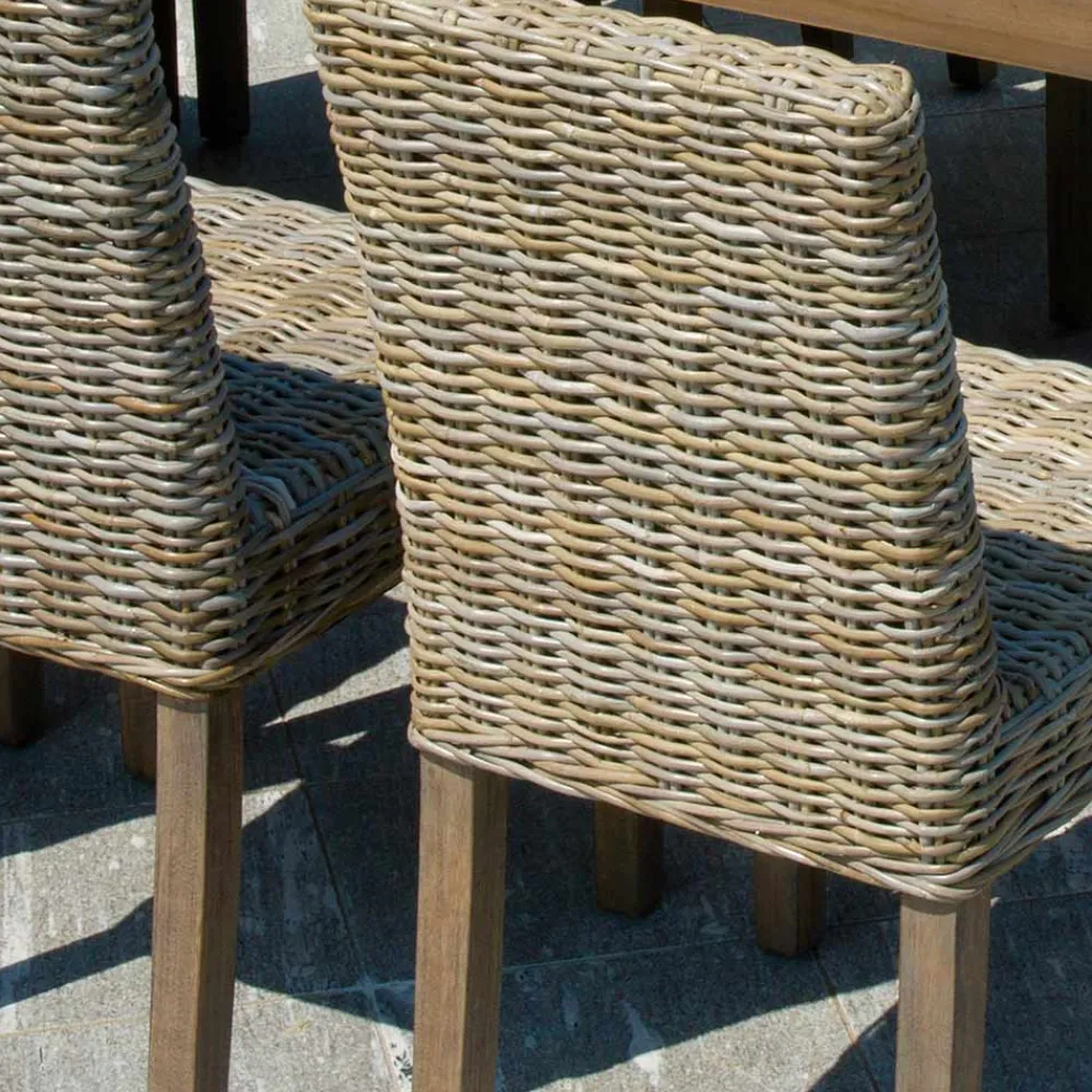 Gartenstuhl mit Holzstruktur , Sitz und Rückenlehne aus natürlicher grauer Kubu-Faser.