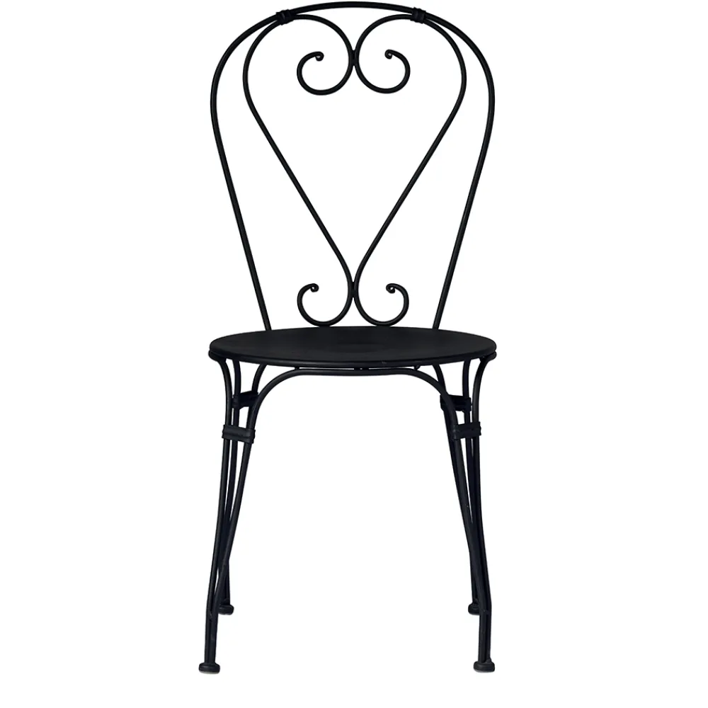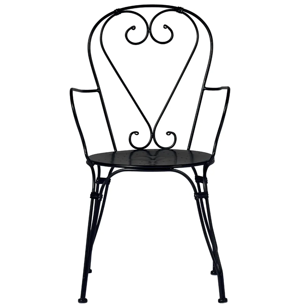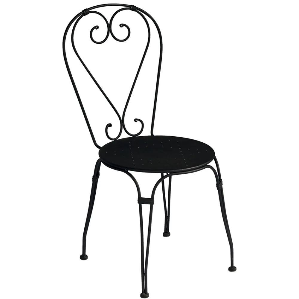 Stapelbarer Outdoor-Stuhl mit Sitz und Struktur aus schwarz lackiertem Eisen mit Rostschutzbehandlung . Der Gartenstuhl zeichnet sich durch das herzförmige Design mit einfachen Linien und nüchternen Formen aus, die ihn dank der geringen Größe, Leichtigkeit und Handhabbarkeit seiner Struktur besonders vielseitig machen.