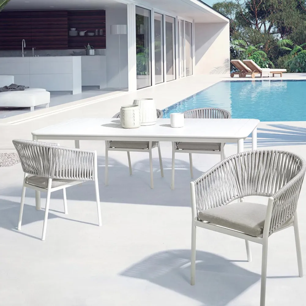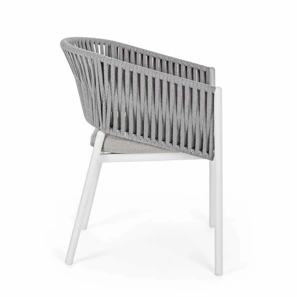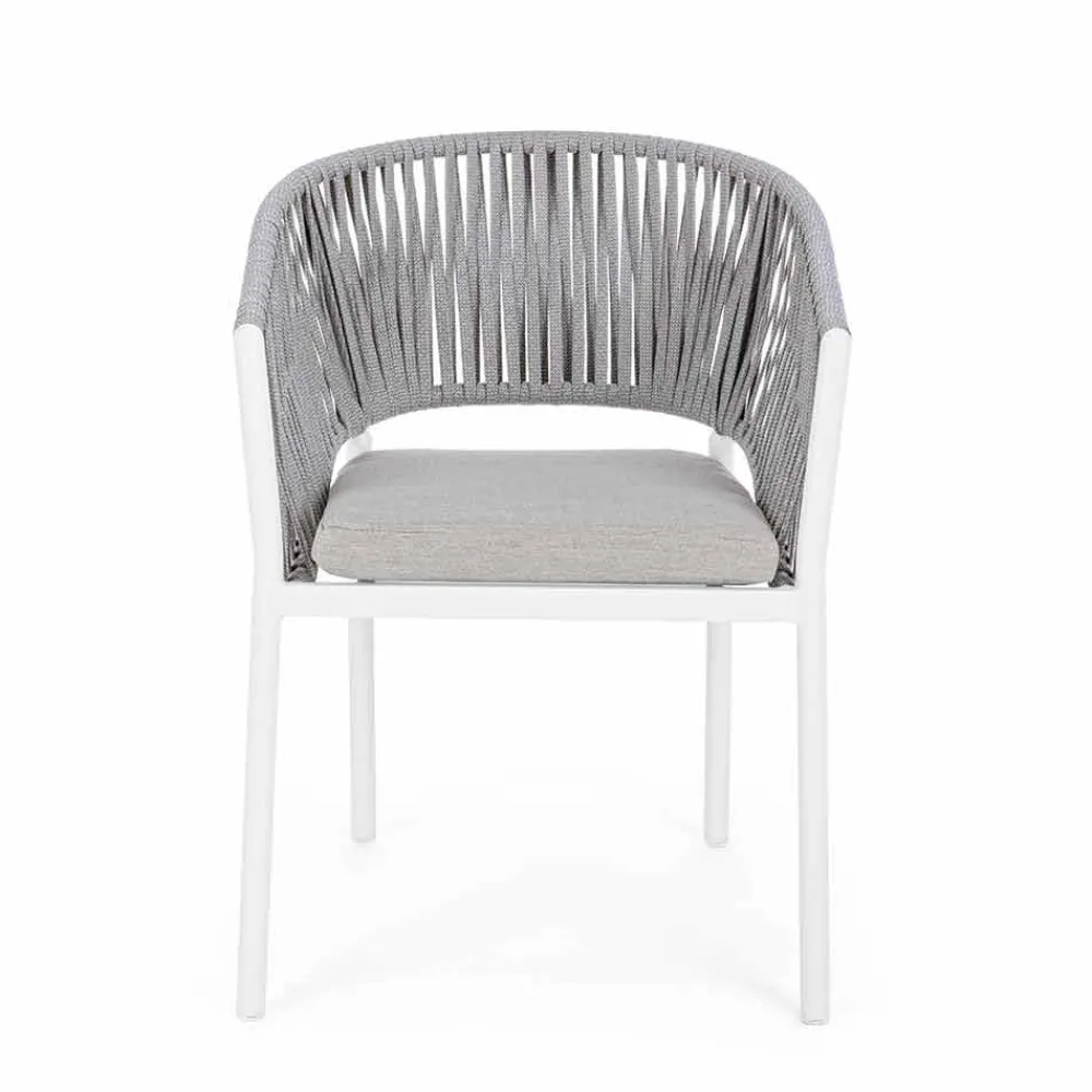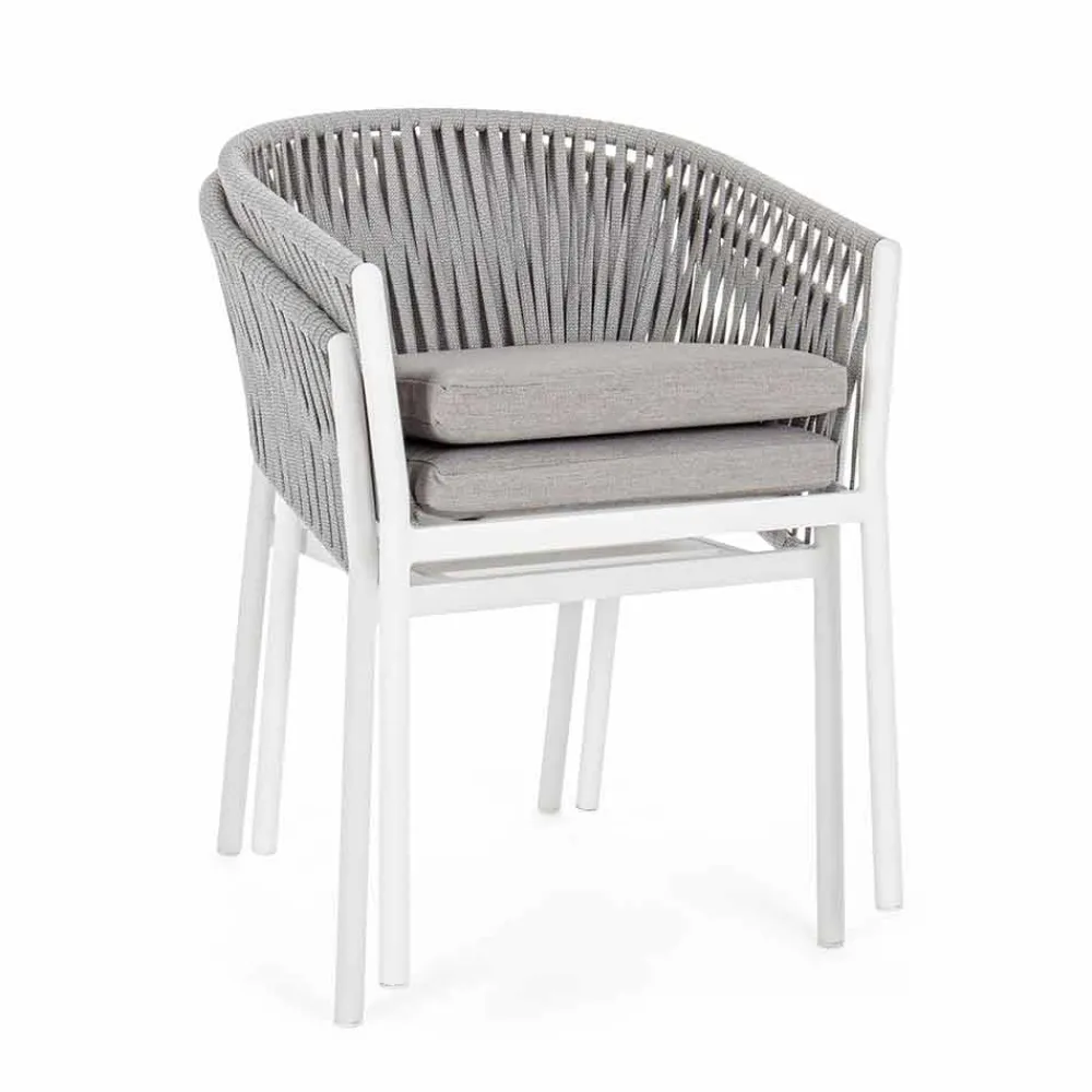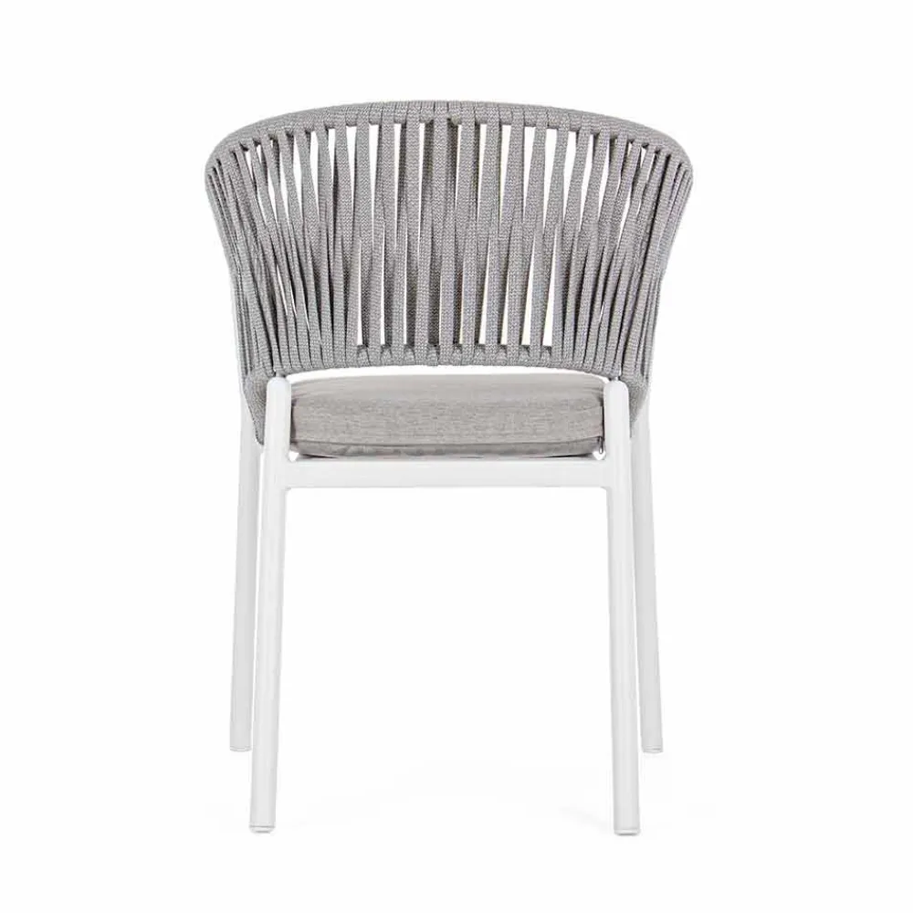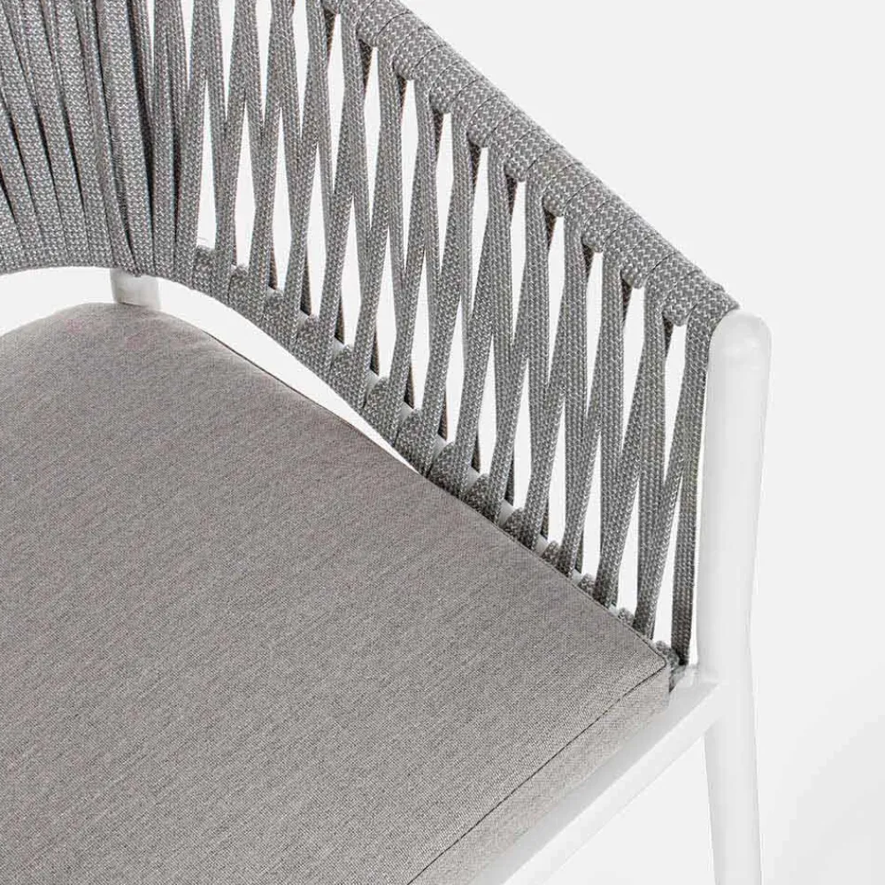 Moderner Gartenstuhl aus weißem Aluminium mit Seil- und Kissenbindung, Design, stapelbar.