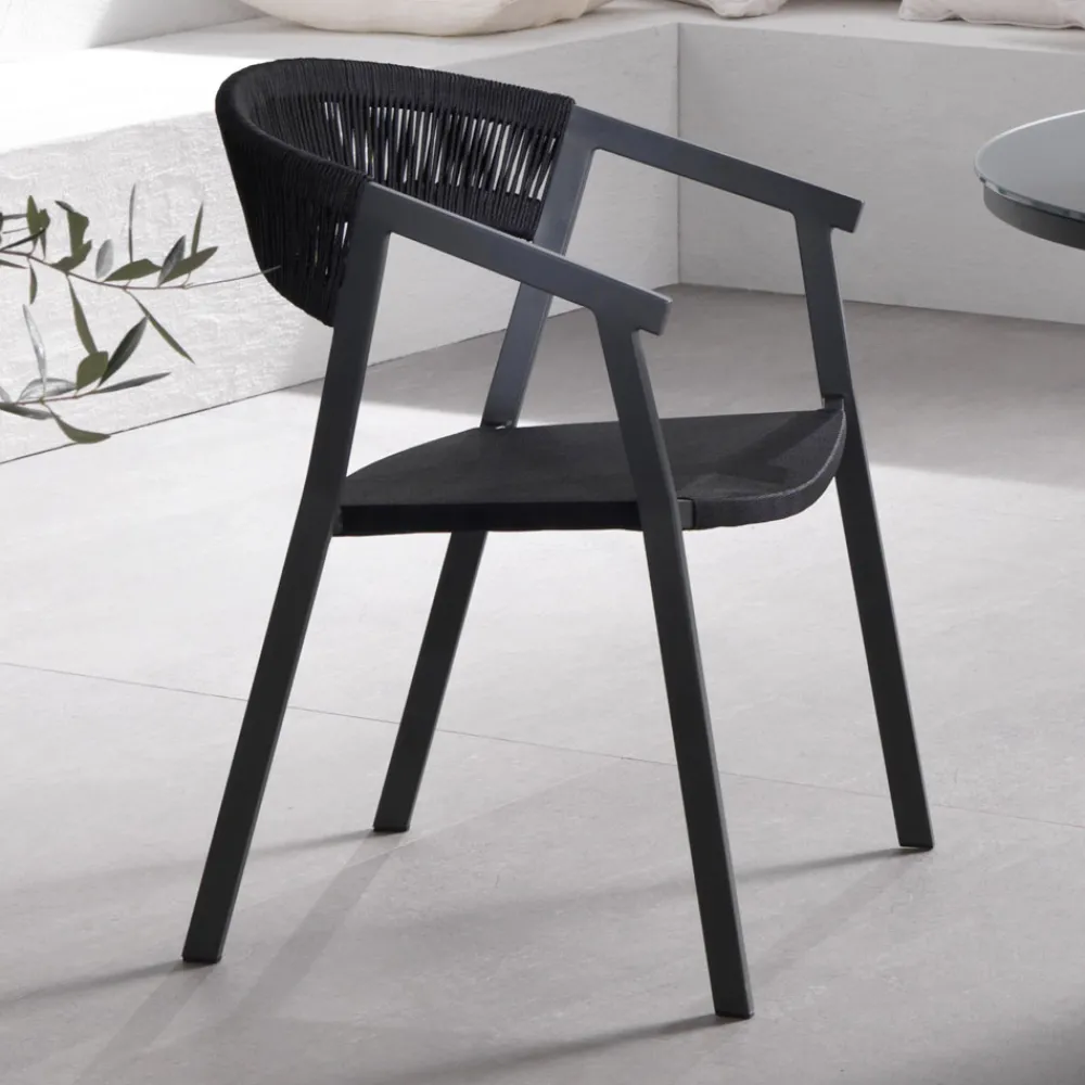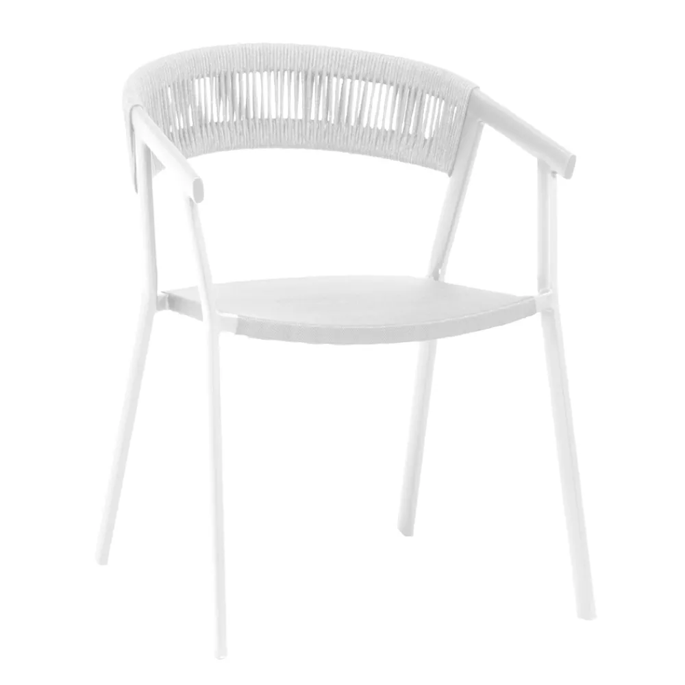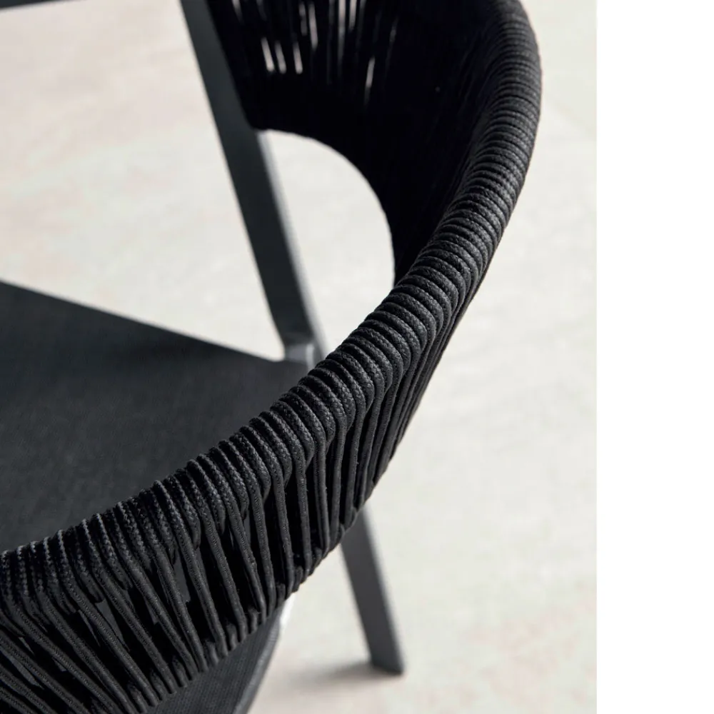 Gartenstuhl aus epoxidpulverbeschichtetem Aluminium mit Sitz aus Aluminium und Rückenlehne aus Seilgeflecht, komplett mit eleganten Armlehnen. Die Formen der Struktur passen sich der Silhouette des Körpers an und bieten natürlichen Komfort, auch dank der Armlehnen, die es Ihnen ermöglichen, eine korrekte Position beizubehalten. Ideal, um Ihre Außenbereiche mit einem einzigartigen und modernen Stil zu dekorieren.