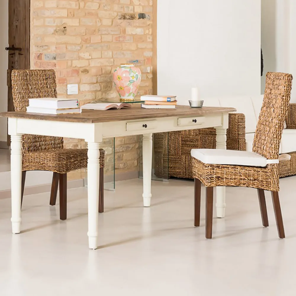 Stuhl für den Außenbereich aus geflochtener Banane und standardmäßig mit Kissen in der Standardausführung “ Ecru “ ausgestattet. Die Stuhlbeine sind aus Holz.