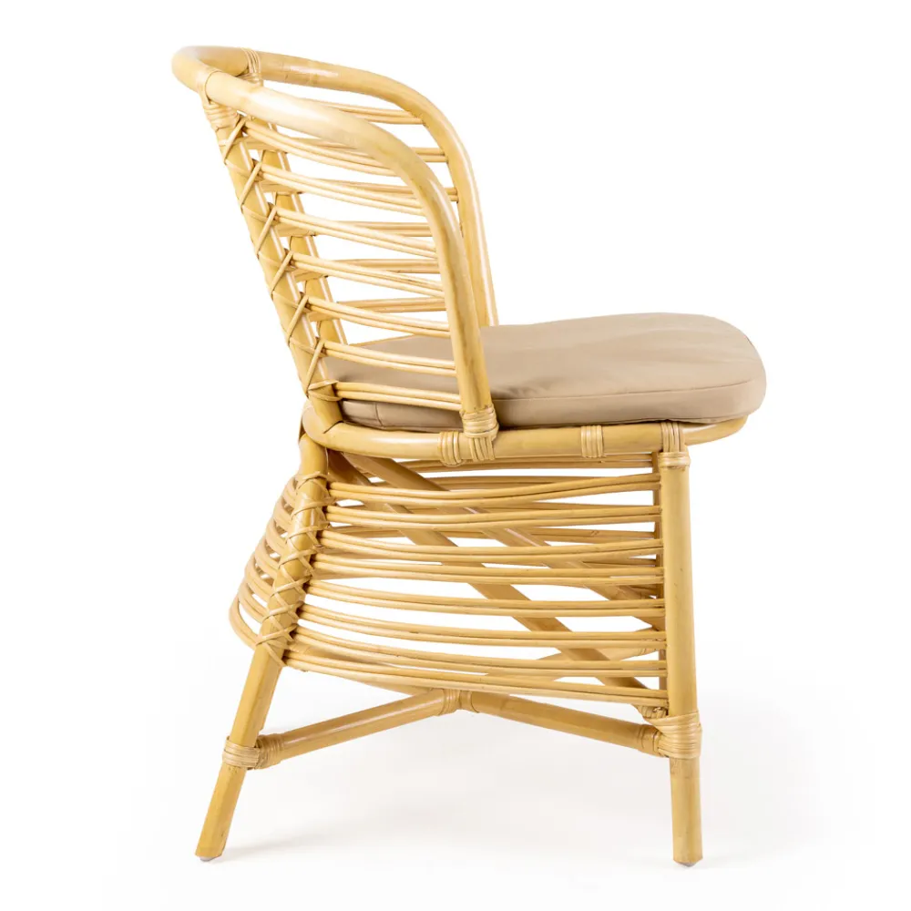 Außenstuhl aus geflochtenem Naturrattan und ausgestattet mit einem Sitzkissen mit Polsterung in der Standard „Stone Beige“ Ausführung.