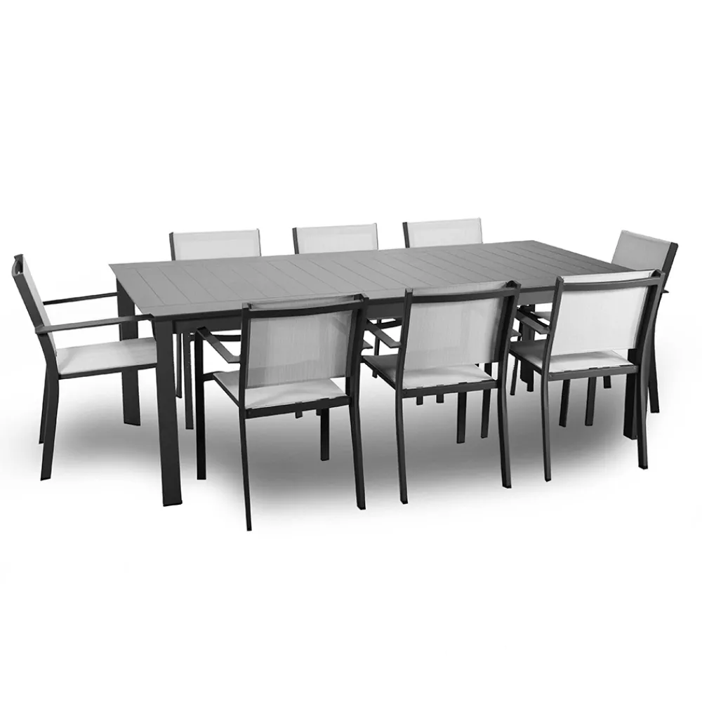 Dieser ausziehbare Aluminiumtisch ist die ideale Wahl für alle, die Vielseitigkeit suchen, ohne auf Stil und Qualität zu verzichten. Gefertigt aus einem stabilen Aluminiumrahmen, kombiniert dieser Tisch Haltbarkeit mit Leichtigkeit, was ihn perfekt für den Einsatz im Freien unter allen Wetterbedingungen macht. Das Finish verleiht ihm einen Hauch von moderner Eleganz, die sich perfekt in jede Umgebung im Freien einfügt, vom Garten bis zur Terrasse.
