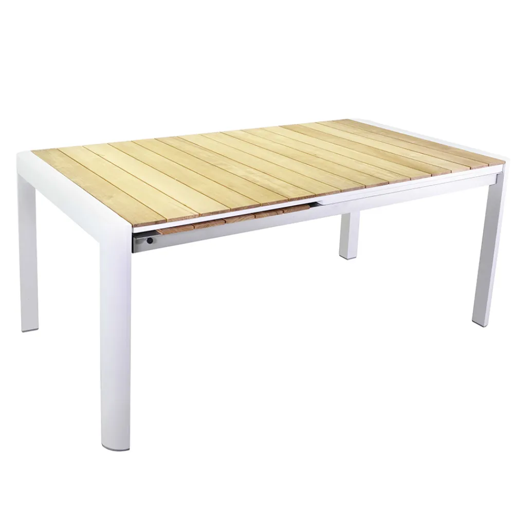 Außentisch mit weißem Aluminiumgestell und Teakholzplatte. Der Tisch kann mit einer seitlichen Schiebeöffnung auf 240 cm verlängert werden.