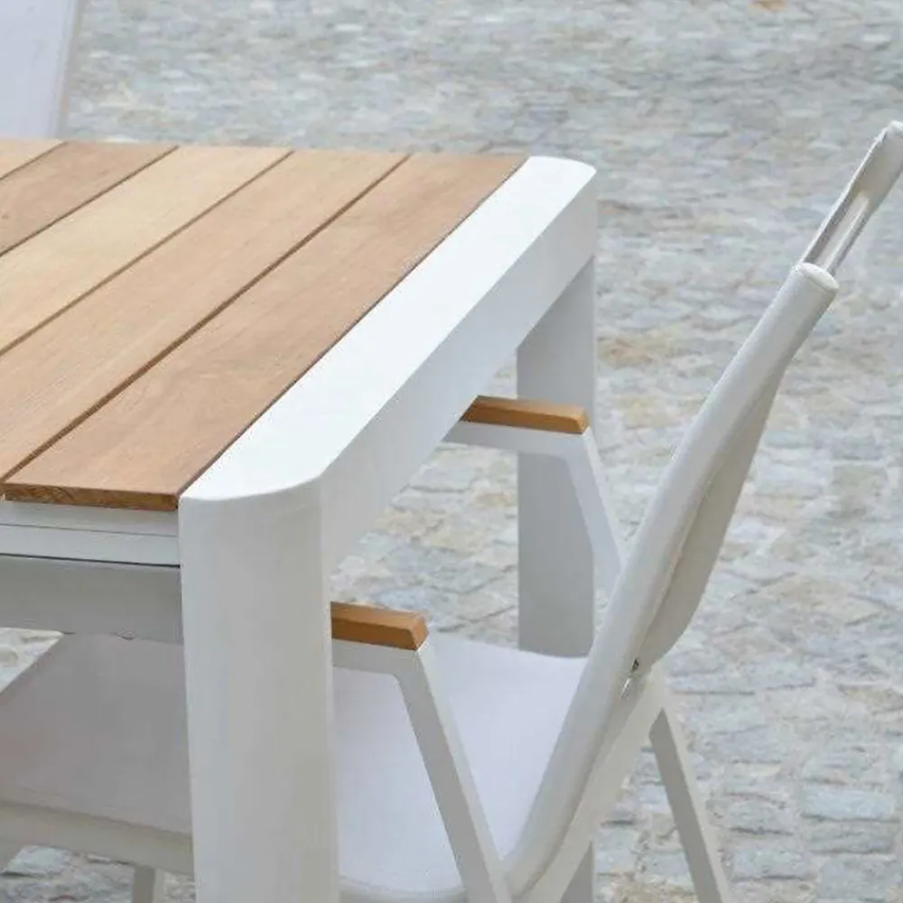Der Tisch ist so konzipiert, dass er zu jeder Gelegenheit passt, indem er sich leicht ausziehen lässt, um mehr Gäste unterzubringen oder sich für den intimeren täglichen Gebrauch verkleinern lässt. Die Kombination aus weißem Aluminium und Teakholz ist nicht nur optisch ansprechend, sondern auch äußerst praktisch, da die Oberfläche leicht zu reinigen und zu pflegen ist.