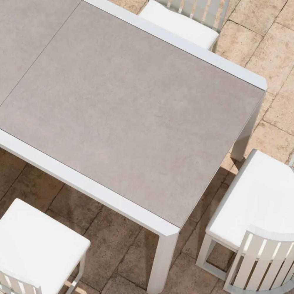 Das raffinierte , elegante und raffinierte Design dieses ausziehbaren Tisches zum Essen im Garten zeichnet sich durch den Wechsel von leeren und vollen Räumen aus, der ein leichtes und zeitgemäßes Erscheinungsbild schafft.