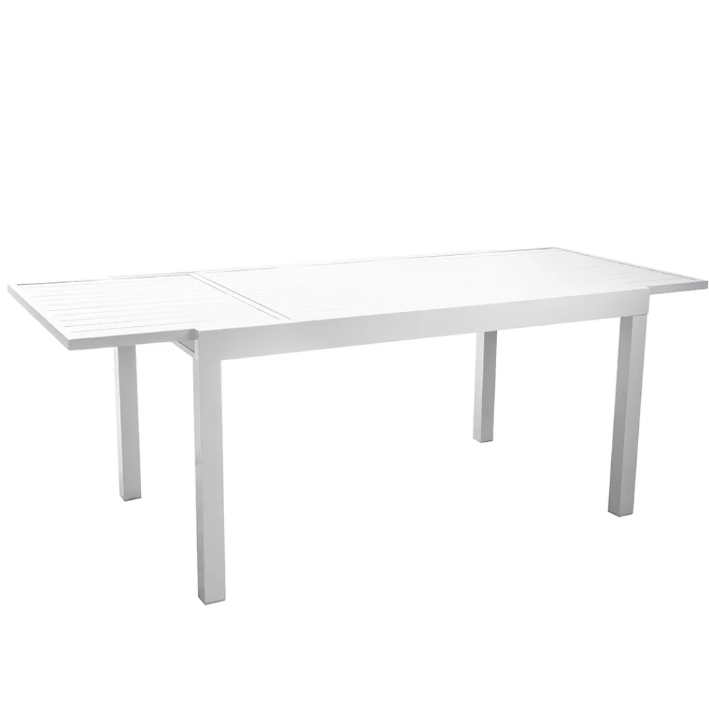 Gartentisch aus pulverbeschichtetem Aluminium mit einer Lattenrostplatte. Der Tisch ist mit einer seitlichen Flügelöffnung ausziehbar.