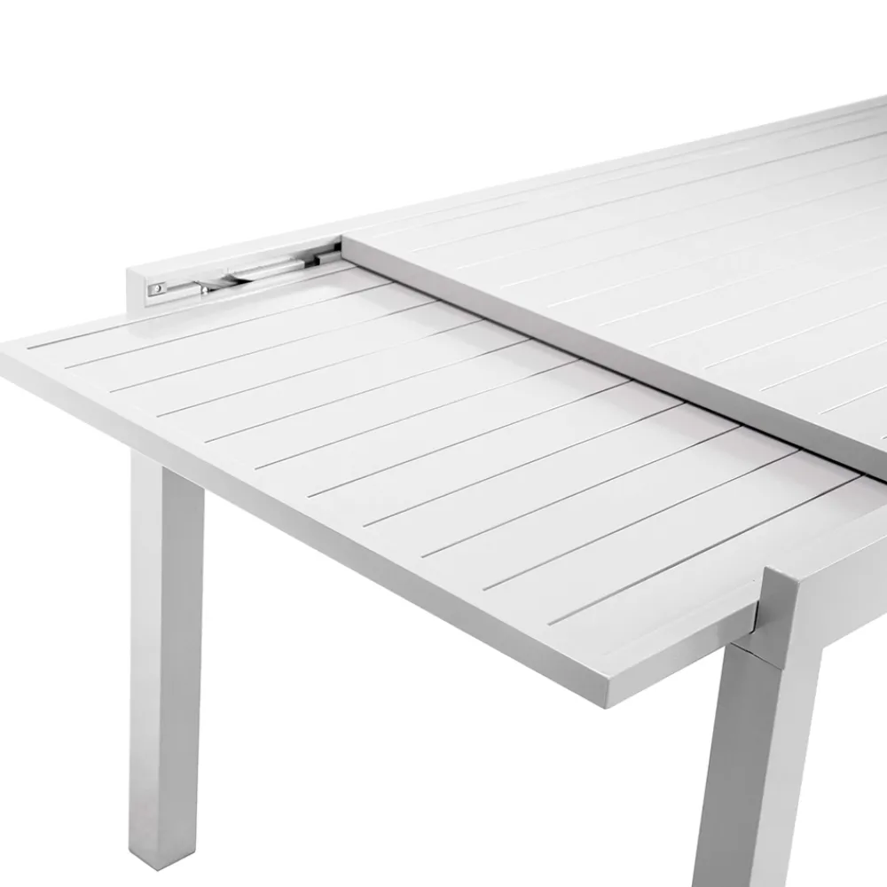 Dank seines ausziehbaren Mechanismus bietet der Tisch die Flexibilität, zusätzliche Gäste mit Leichtigkeit unterzubringen, was ihn perfekt für Dinnerpartys, Empfänge oder einfach zum Entspannen im Freien macht. Sein Aluminium-Gestell garantiert eine lange Lebensdauer und Widerstandsfähigkeit gegen Witterungseinflüsse, so dass Ihre Investition nicht nur schön, sondern auch praktisch ist.