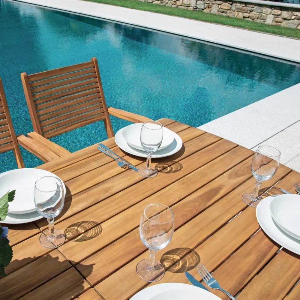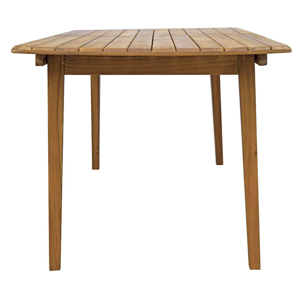 Dieser Tisch aus Akazienholz , das für seine Robustheit und Langlebigkeit bekannt ist, ist nicht nur ästhetisch ansprechend, sondern auch witterungsbeständig, was eine lange Lebensdauer des Produkts gewährleistet. Das schlichte und geradlinige Design passt sich perfekt jeder Außenumgebung an und schafft eine einladende und anspruchsvolle Atmosphäre für Ihre Abendessen im Freien.