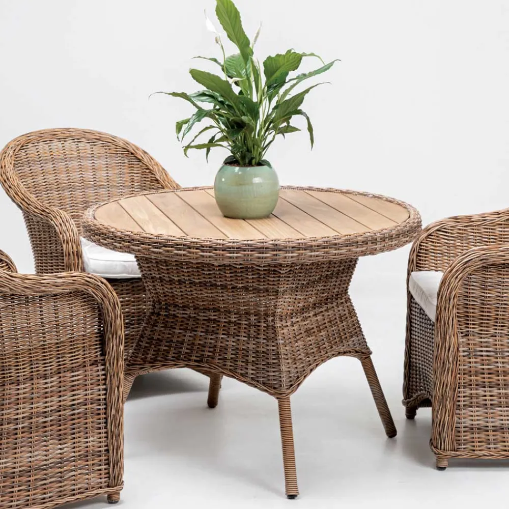 Dieser Gartentisch ist eine charmante Ergänzung für jeden Außenbereich. Seine Geflechtstruktur aus Polyrattan ist eine Demonstration von natürlichem Design, das den Elementen widersteht und mit der Zeit immer schöner wird. Die Tischplatte aus natürlichen Teak-Latten lädt zu entspannenden und geselligen Momenten im Freien ein.