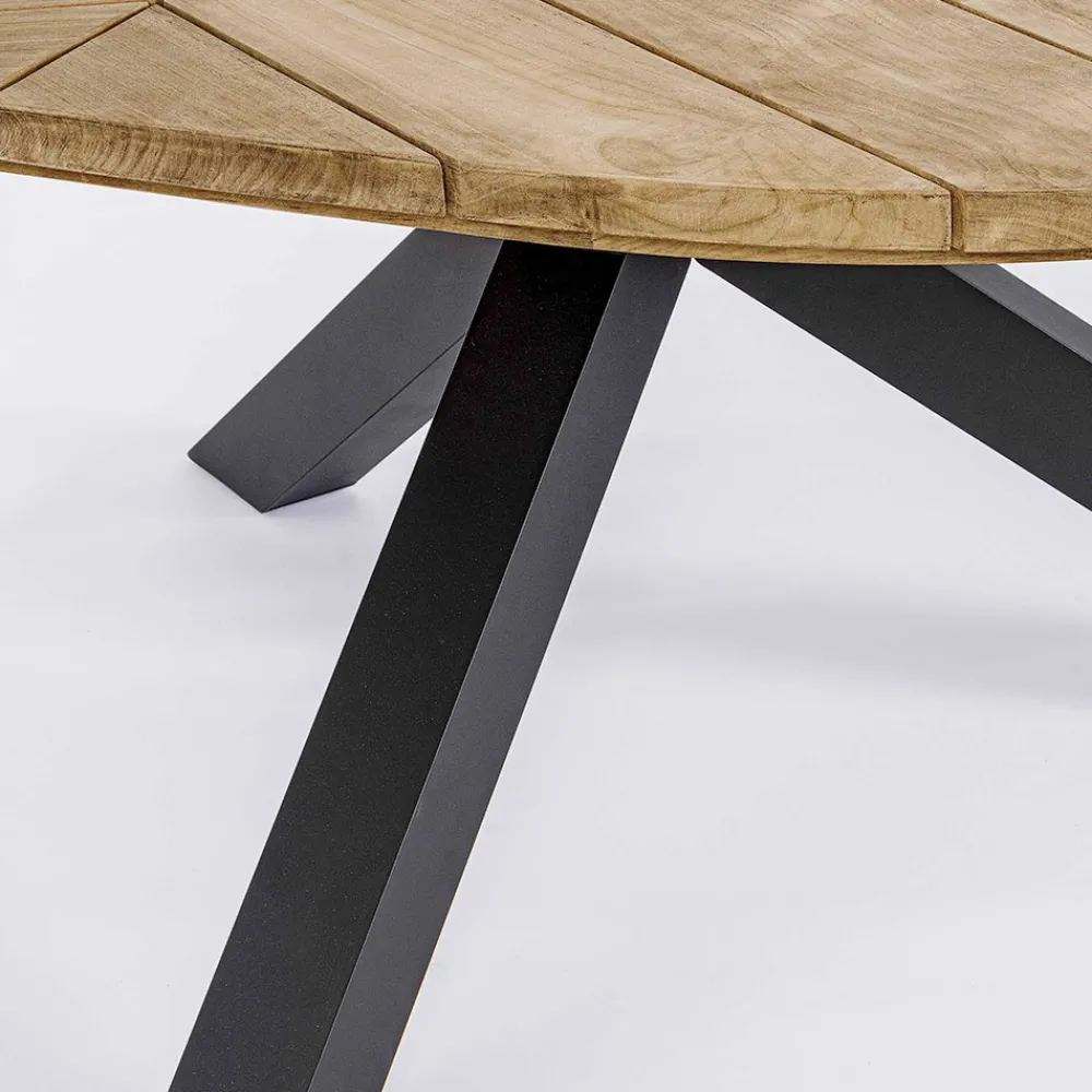 Runder Esstisch im Freien aus Aluminium mit Platte aus hochwertigem Teakholz.