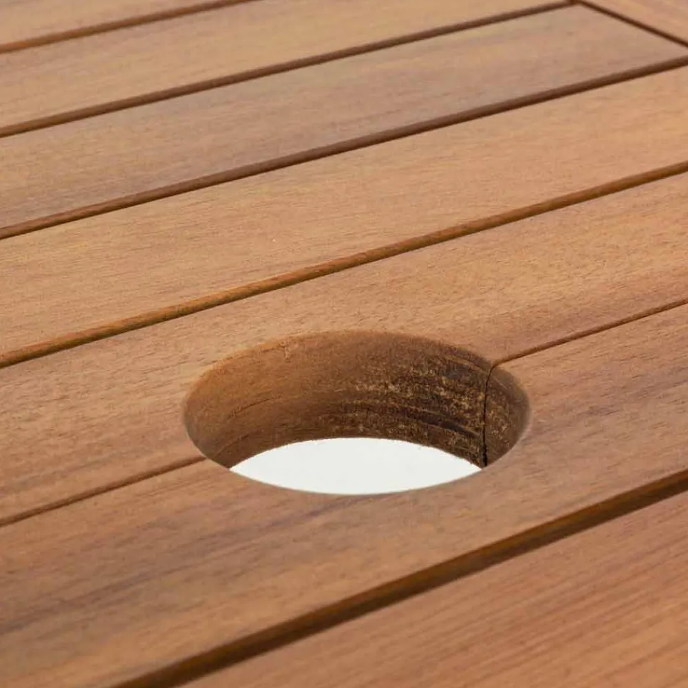 Akazienholzstruktur mit Ölfinish, verzinkte Stahlbeschläge. Erweiterbar. Kunststoffschiebestangen.