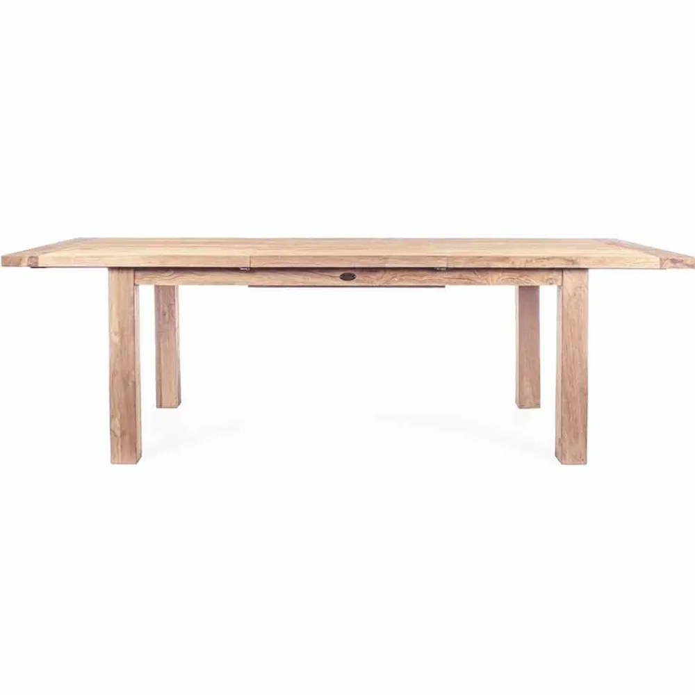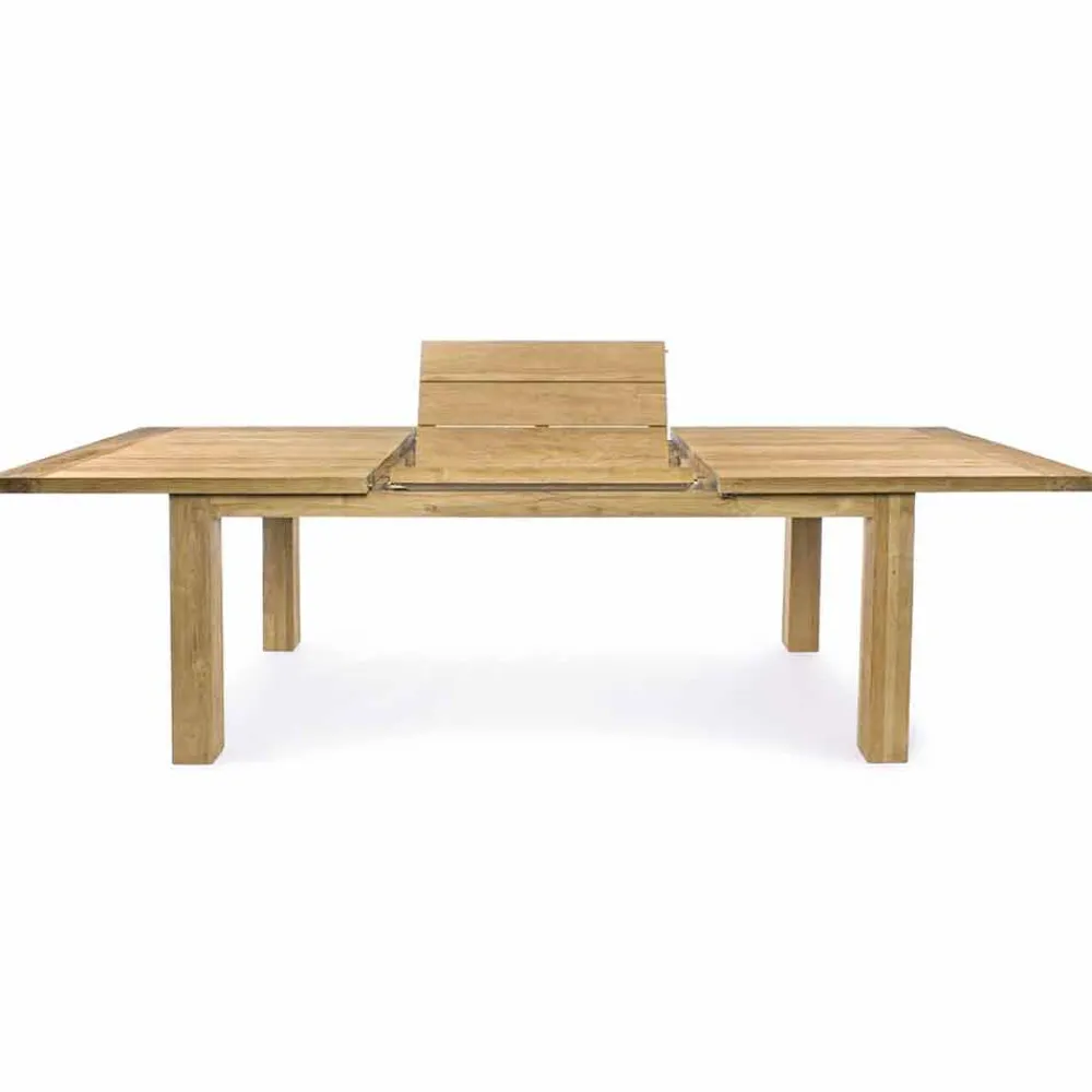 Rechteckiger ausziehbarer Gartentisch aus natürlichem recyceltem Teakholz, erhältlich in zwei Größen.