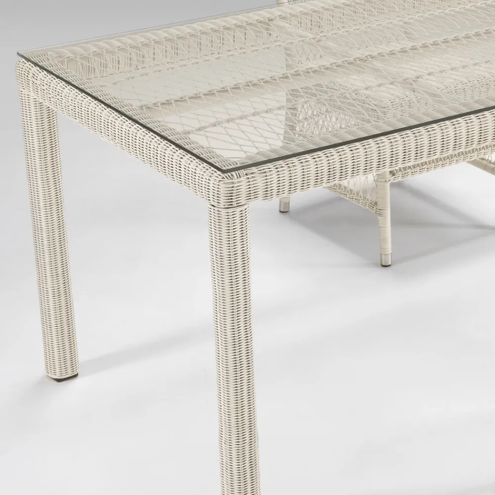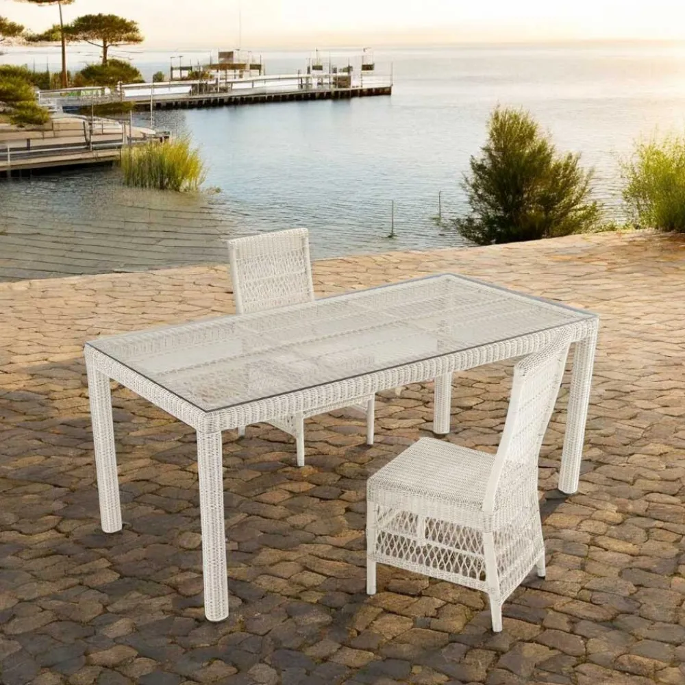 Garten Zusammensetzung bestehend aus: rechteckigen Tisch mit Aluminium Basis und Polyrattan-Geflecht Marke REHAU und Glasplatte, 4 Stühle und 2 Sessel mit Armlehnen mit Aluminiumrahmen und Polyrattan-Geflecht Marke REHAU. Diese Zusammensetzung zeichnet sich durch seine starke klassisches Design, ein Stil aus der Vergangenheit in der Mode in den 60er und 70er Jahren in einem Outdoor-Schlüssel wieder aufgegriffen. Der Geflechtstil ist raffiniert und zart und zusammen mit der sehr hohen Qualität der Materialien und den entschiedenen Formen machen diese Garnitur perfekt für die Einrichtung von Innen- und Außenbereichen, sowohl im privaten als auch im Objektbereich wie Terrassen, Veranden, Gärten, aber sie finden auch einen perfekten Platz am Pool.