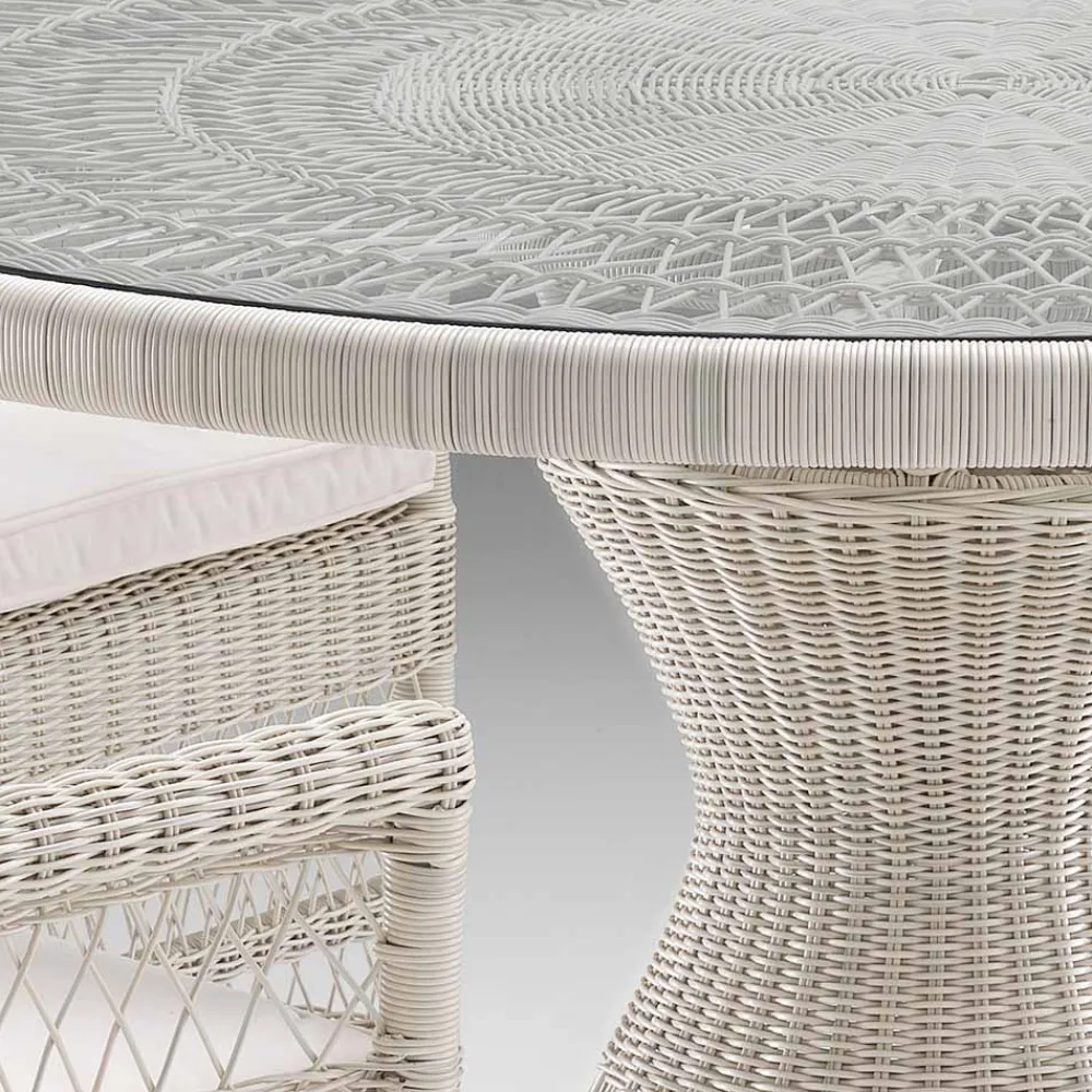 Runder Esstisch für den Außenbereich aus handgeflochtener Polyrattanfaser und Glasplatte