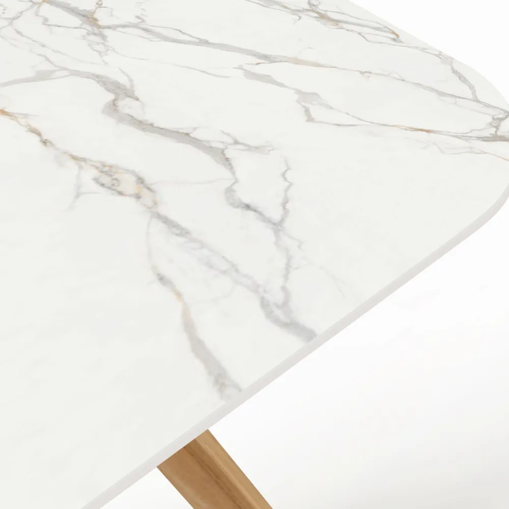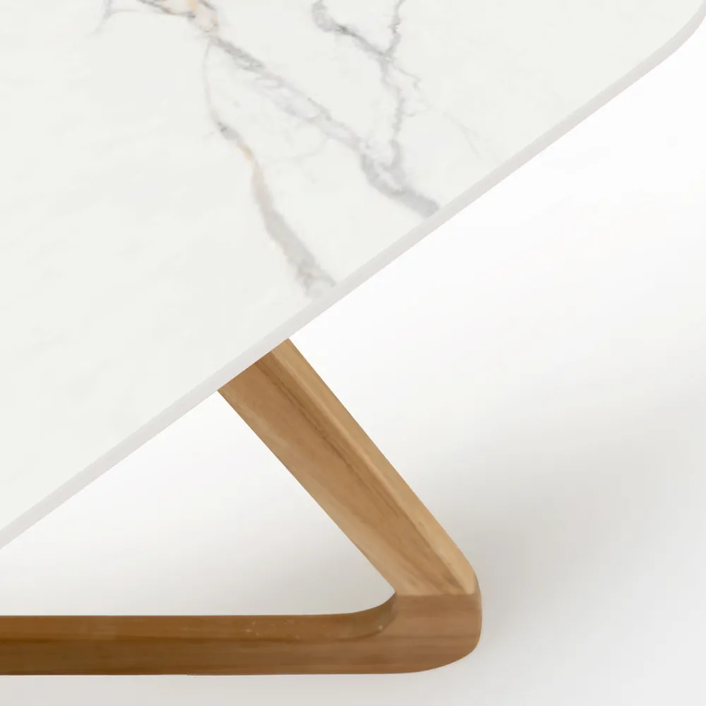 Dieser Außentisch mit einer Calacatta Oro Keramikplatte ist ein Tribut an zeitlose Eleganz und subtilen Luxus. Er kombiniert einen warmen und einladenden Holzsockel mit einer Keramikplatte, die perfekt dem Marmor Calacatta Oro nachempfunden ist, der für seine einzigartige goldene Maserung auf weißem Grund bekannt ist.