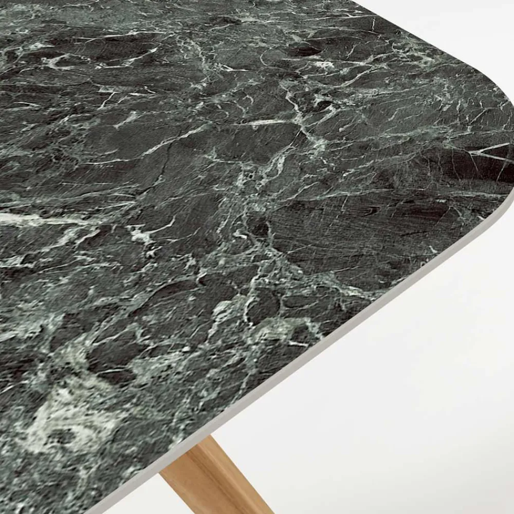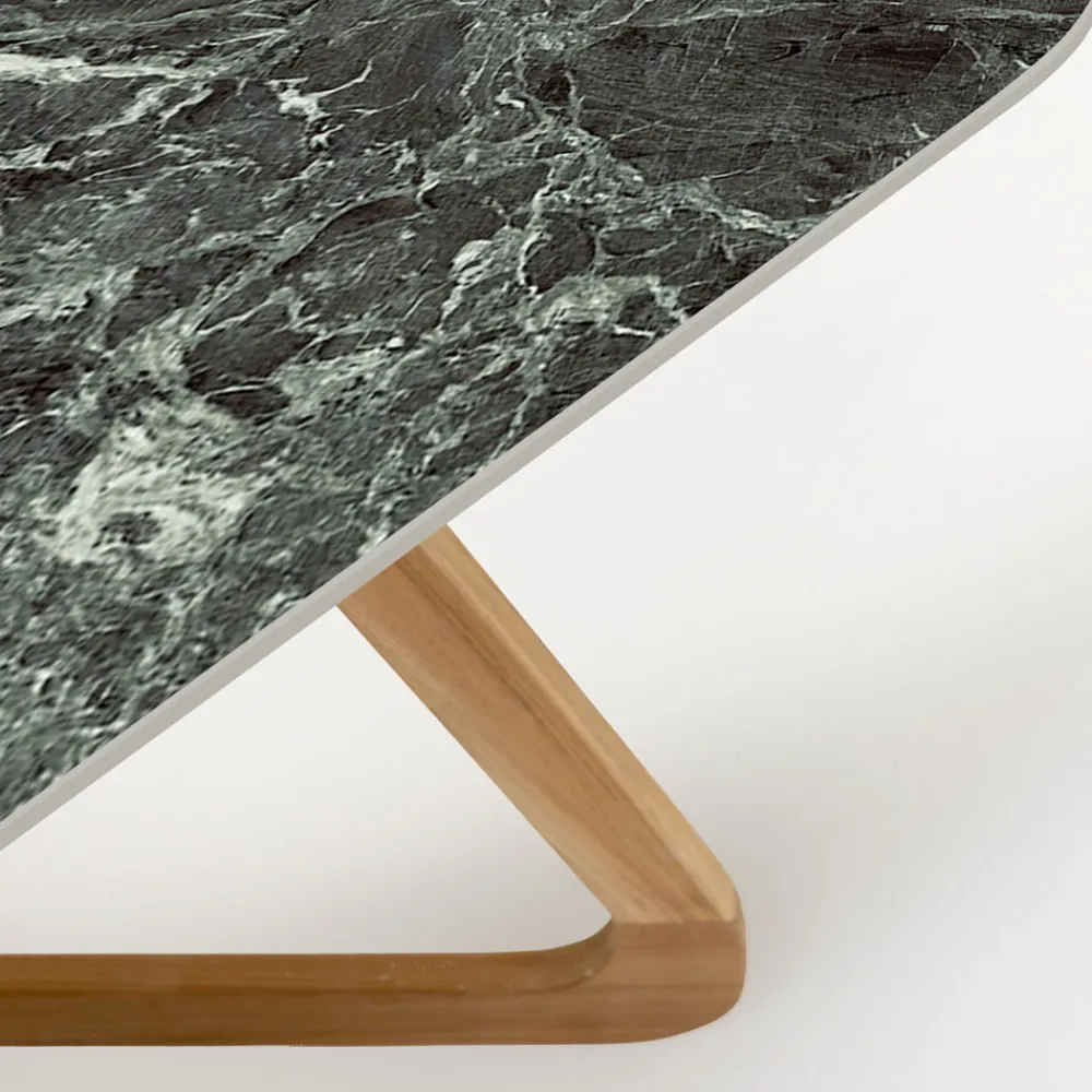 Die Keramikplatte, die sich durch eine faszinierende dunkelgrüne Farbe mit helleren Adern auszeichnet, bietet nicht nur eine optisch auffällige Oberfläche, sondern ist auch extrem witterungsbeständig und leicht zu pflegen. Das italienische Design dieses Tisches kommt in der Holzbasis voll zum Ausdruck, die einen schönen Kontrast zur modernen Keramikplatte bildet und Stabilität und eine zeitlose Anziehungskraft bietet.