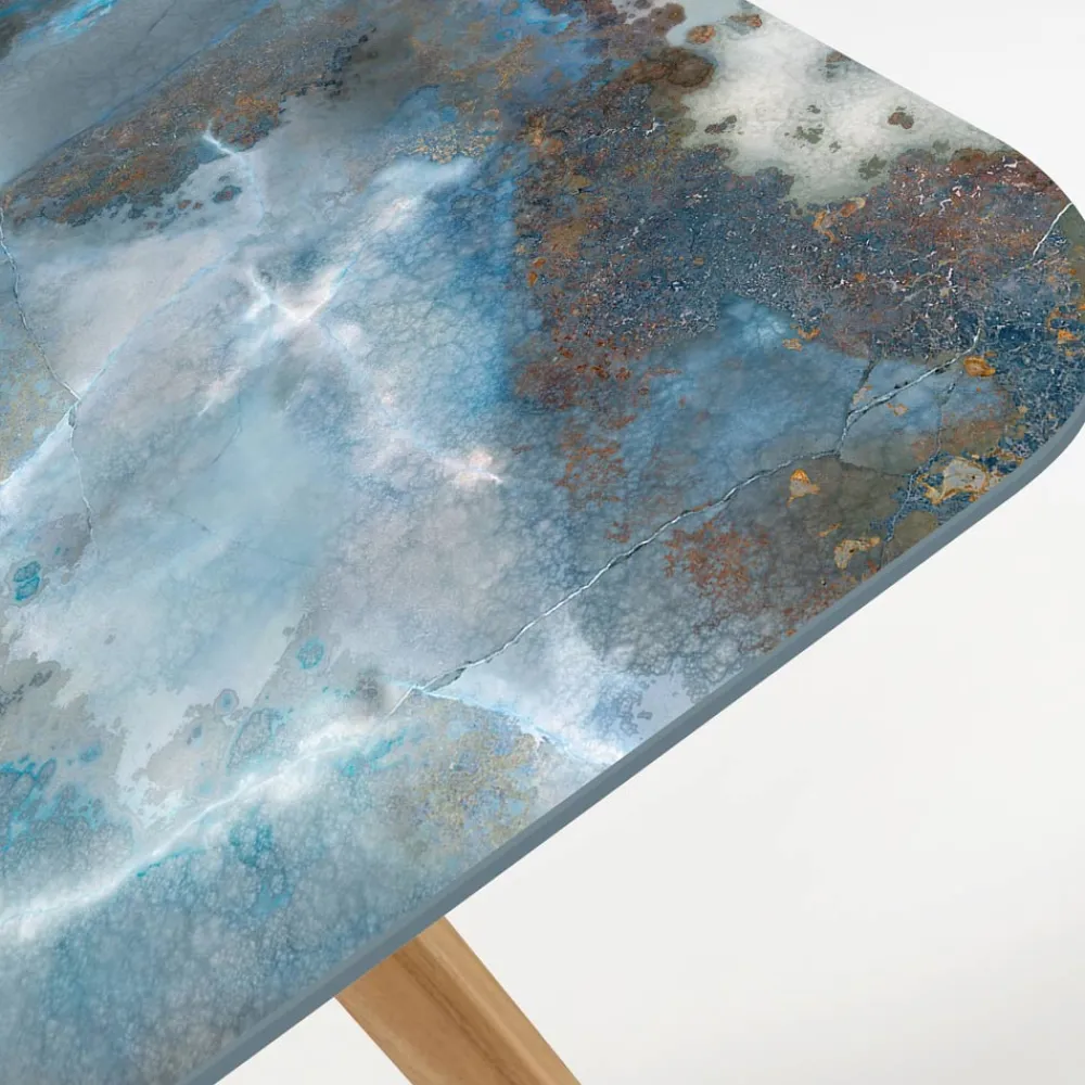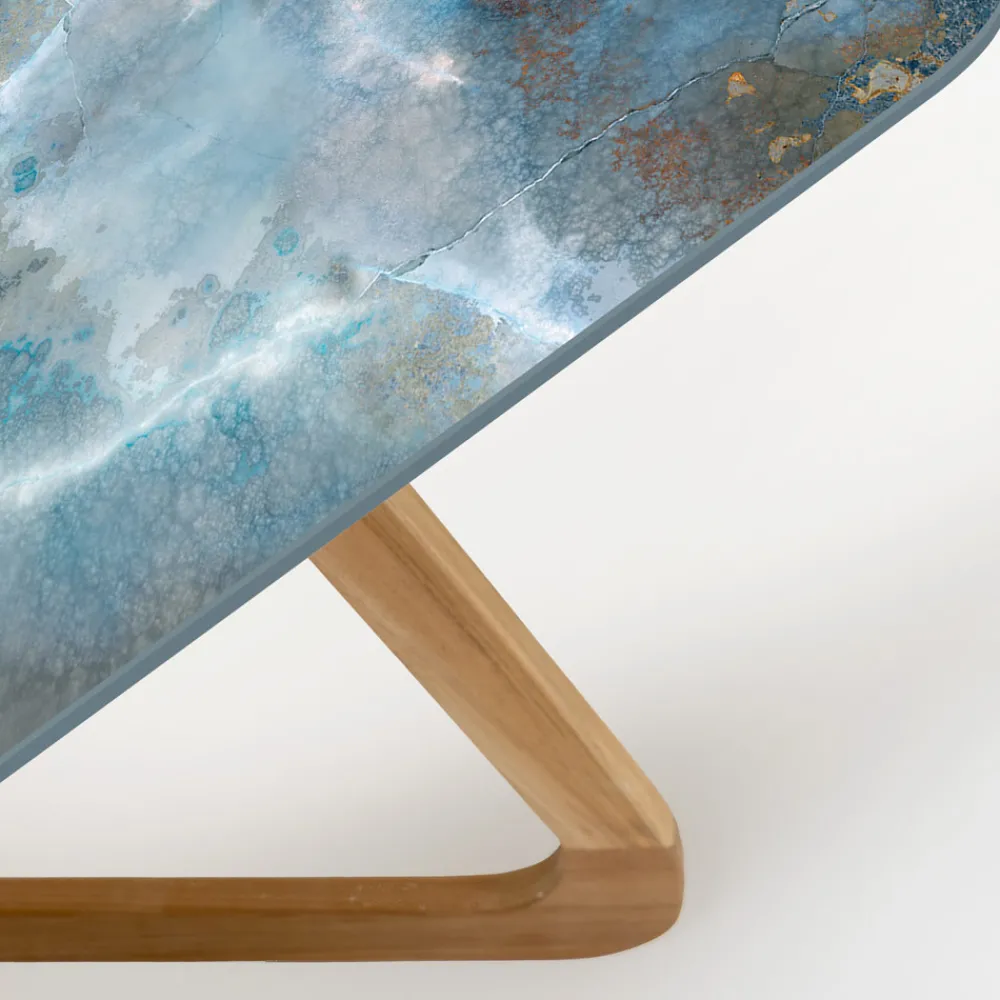 Dieser Außentisch ist eine perfekte Verbindung von natürlicher Eleganz und moderner Kunst. Die Tischplatte aus hochwertiger Keramik hat ein einzigartiges Finish, das die organischen Strukturen und leuchtenden Farben einer Felsformation nachahmt, mit Akzenten in Blau, Grau und Kupfer. Diese Oberfläche ist nicht nur ein echter Hingucker, sondern auch extrem langlebig und damit ideal für den täglichen Gebrauch im Freien.