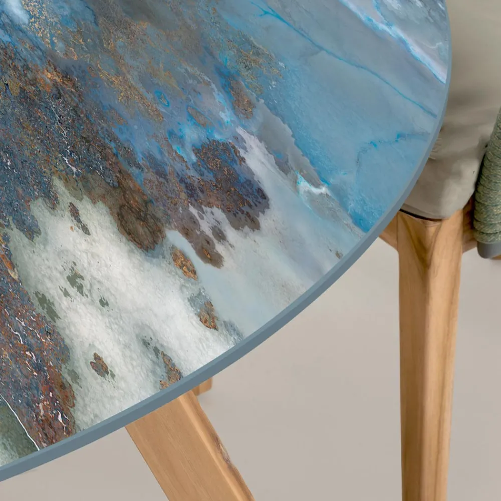 Der Holzsockel bietet nicht nur eine solide Stütze, sondern führt auch ein Element der Wärme und Natürlichkeit ein, das in schönem Kontrast zur Lebendigkeit der Platte steht und ein ästhetisches Gleichgewicht schafft, das sowohl einladend als auch beeindruckend ist. Der Tisch ist nicht nur ein auffälliger Blickfang für jeden Außenbereich, sondern auch äußerst beständig und pflegeleicht, perfekt für die Bewirtung von Gästen zu besonderen Anlässen oder für entspannte Momente im Freien.