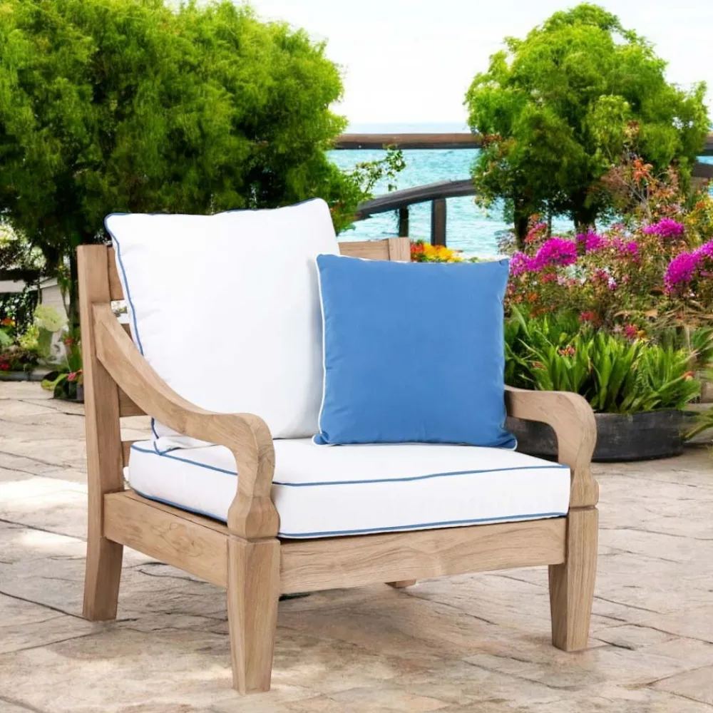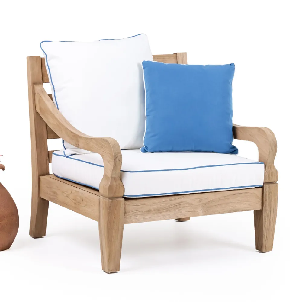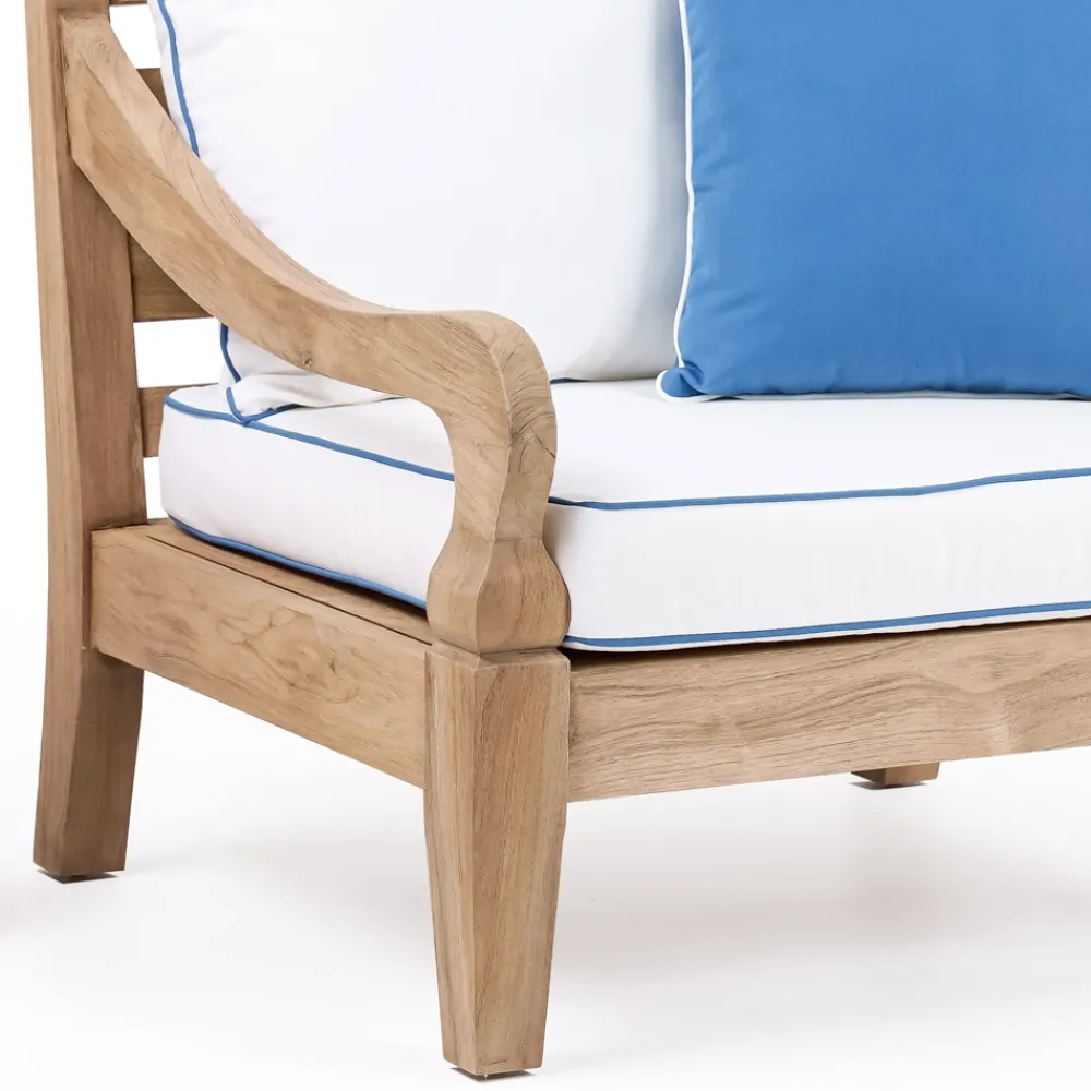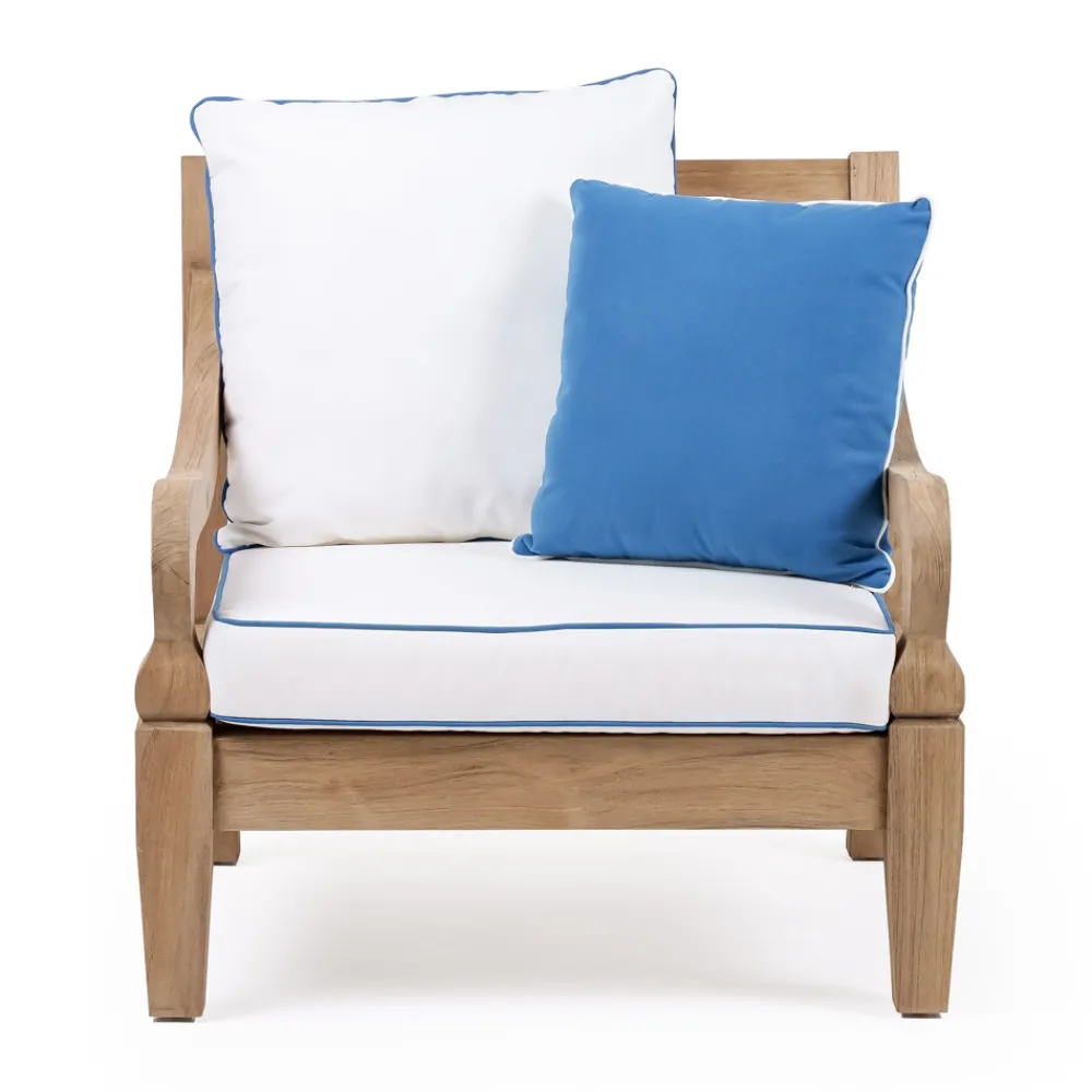 Gartensessel ganz aus gebürstetem Natur-Teakholz mit speziellen Sitz- und Rückenkissen aus „weißem“ Outdoor-Stoff mit kontrastierender „ozeanblauer“ Paspelierung und blauen Zierkissen mit weißer Paspelierung inklusive.