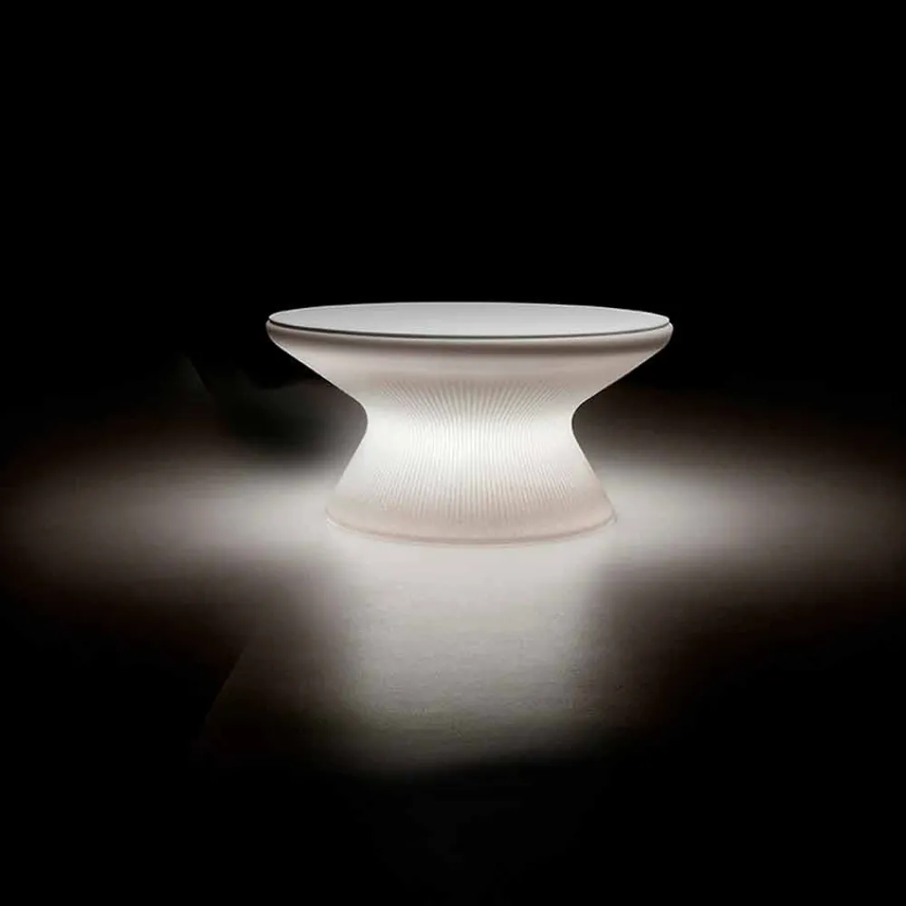 Couchtisch im Freien mit Struktur aus Polyethylen und runder Platte aus weißem HPL, hergestellt in Italien . Es ist einfach und modern und zeichnet sich durch die besondere gestreifte Oberfläche der Struktur aus, die dank des LED-Lichts, das die Basis des Tisches beleuchtet und ideale Atmosphären für wundervolle Abende in Gesellschaft zum Leben erweckt, exzentrische Lichtspiele erzeugen kann . Sein minimalistisches Design mit originalen Merkmalen macht es zu einem äußerst vielseitigen Produkt, das sich ideal für Außenbereiche wie Gärten und Terrassen eignet, aber auch für Vertragsumgebungen, in denen mit Stilen gespielt werden kann, um eine einzigartige und faszinierende Ästhetik zu schaffen.