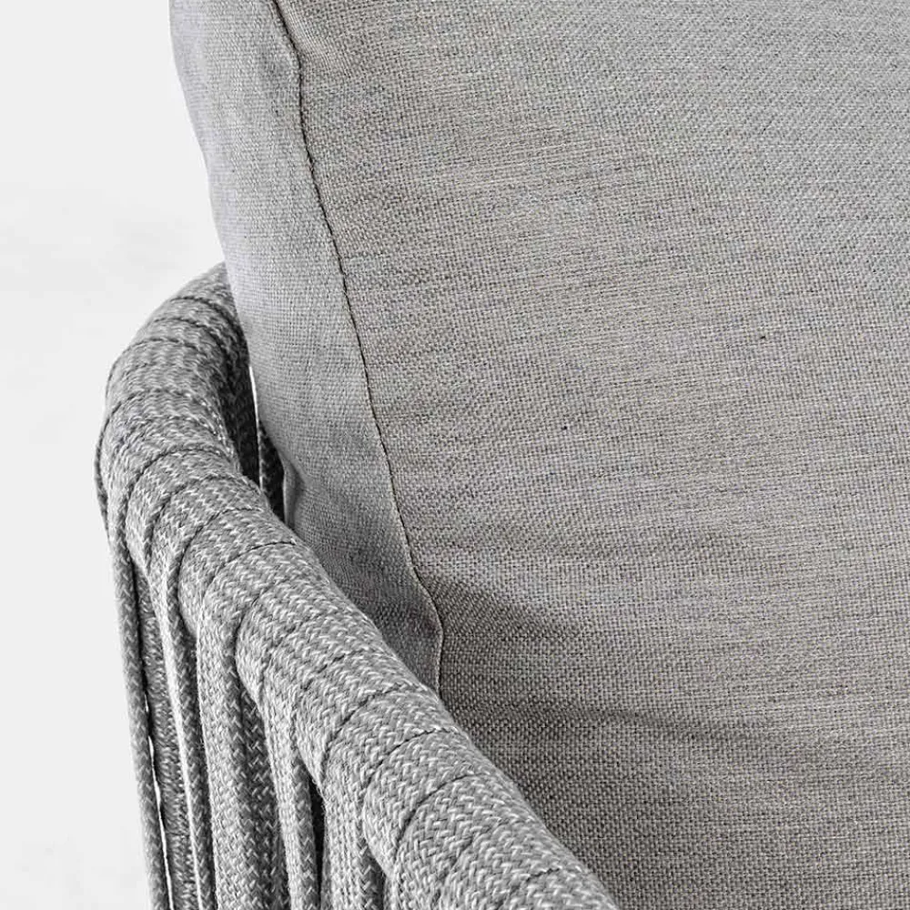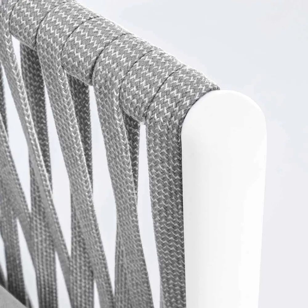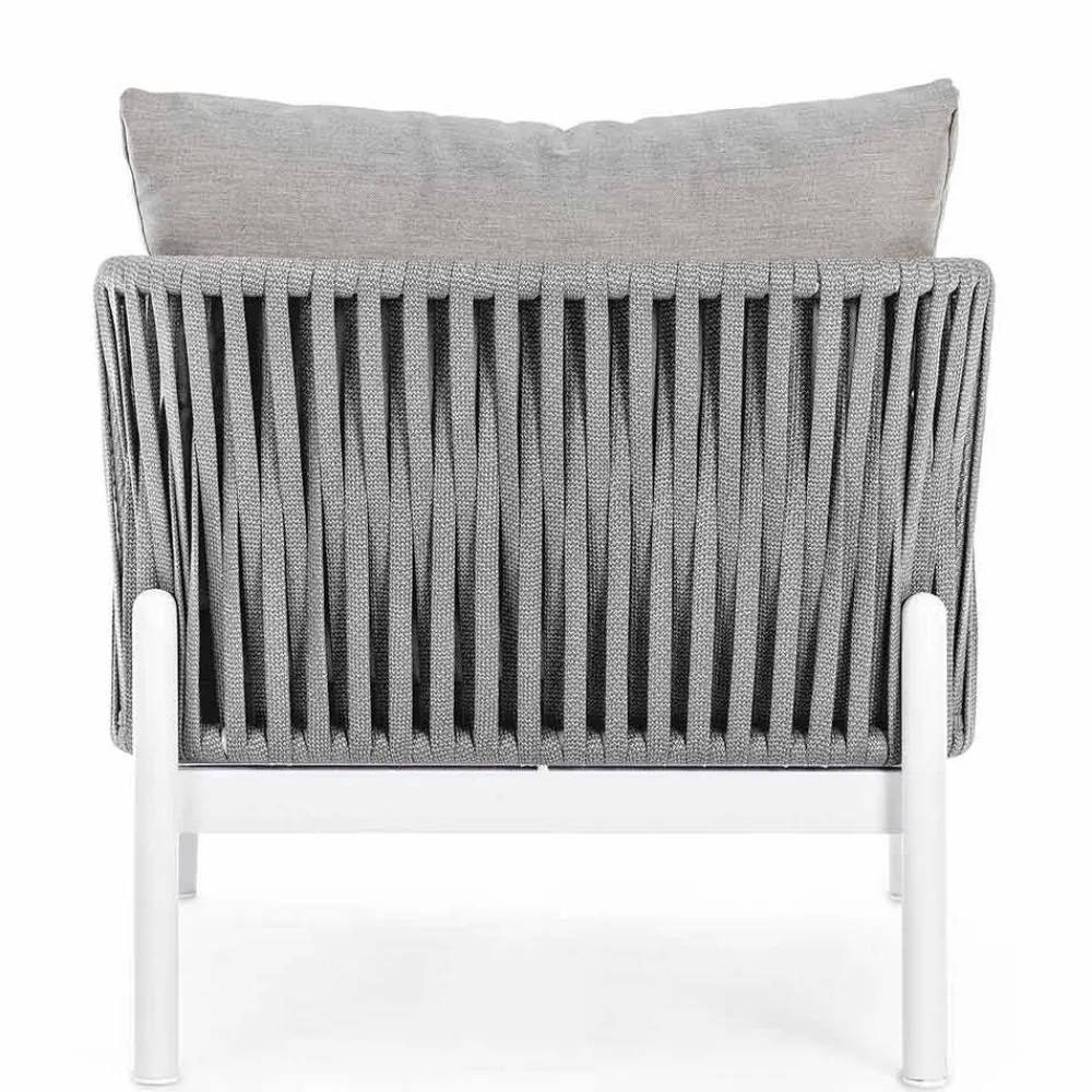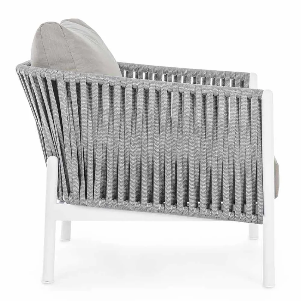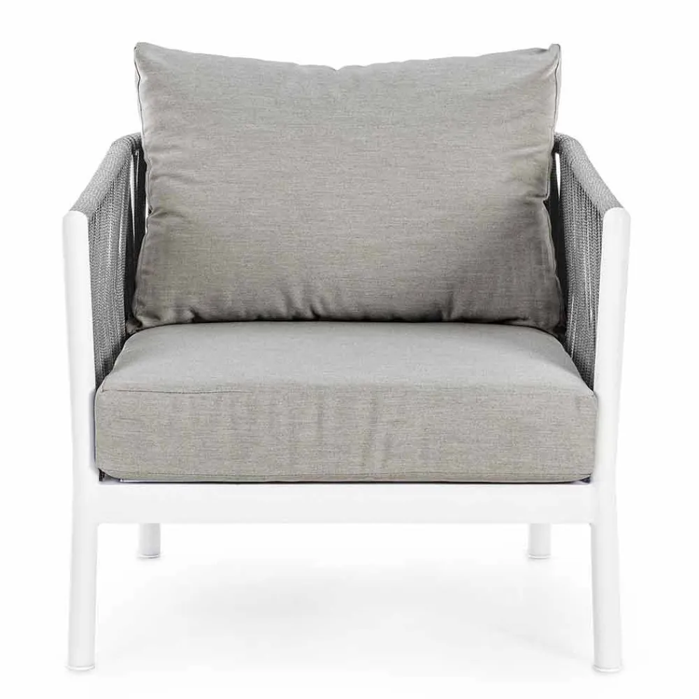 Outdoor-Design-Sessel mit weißer Aluminiumstruktur und abnehmbaren Kissen.