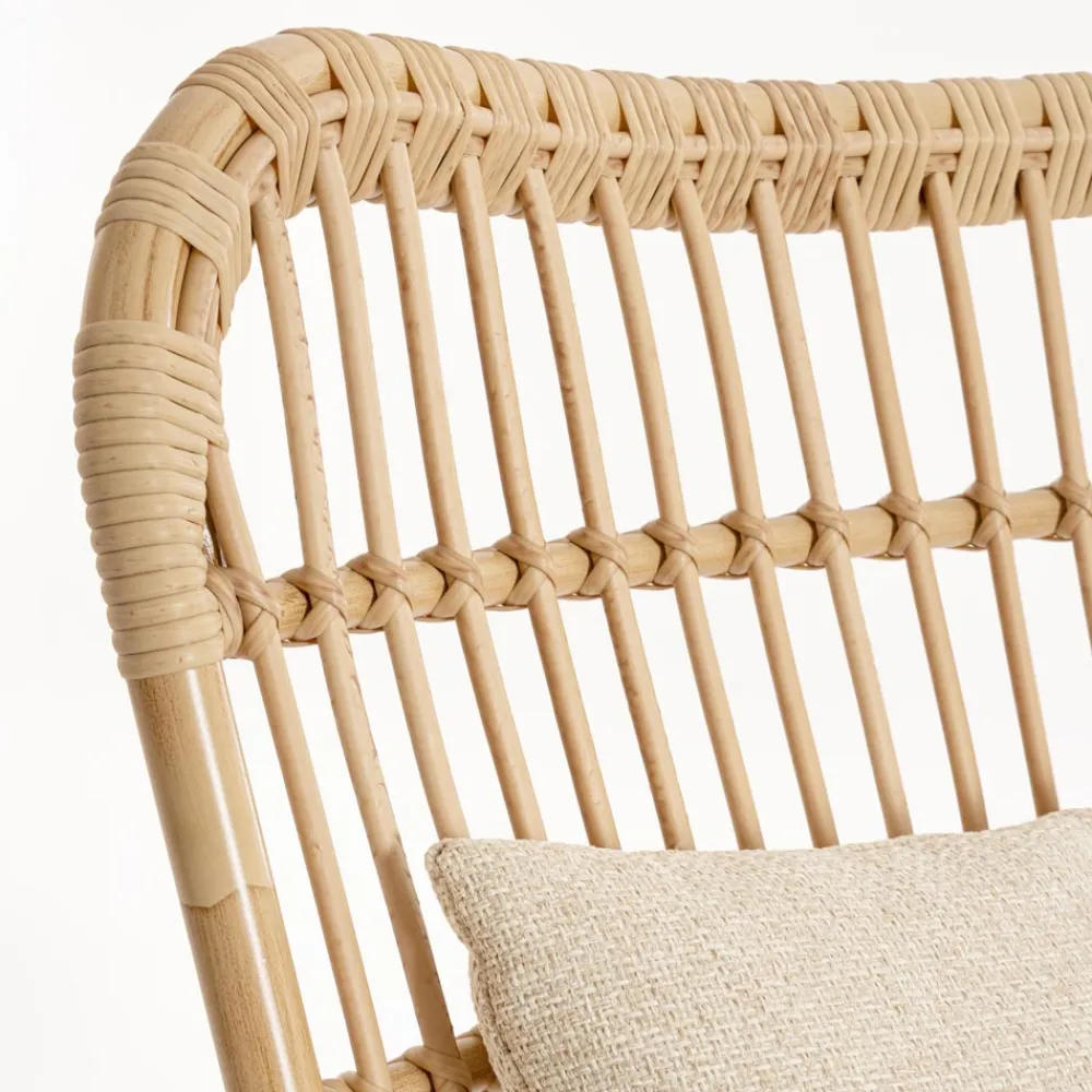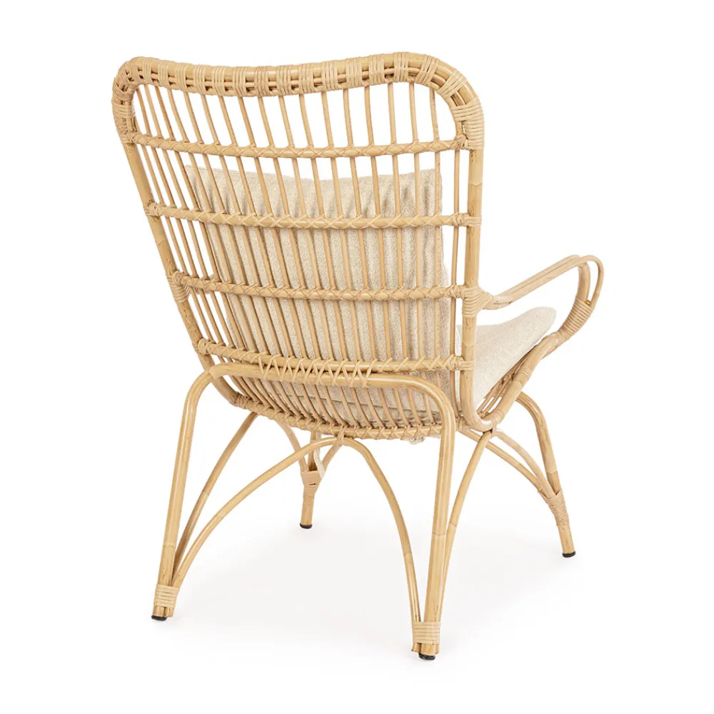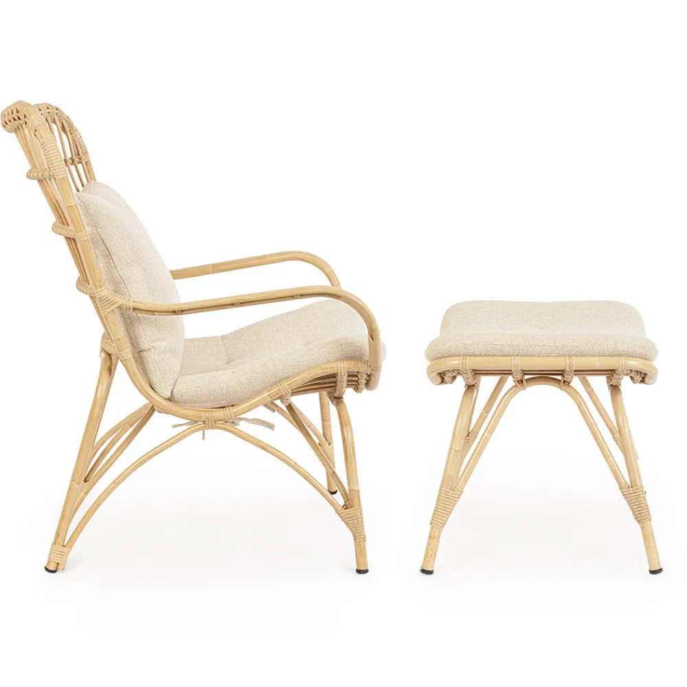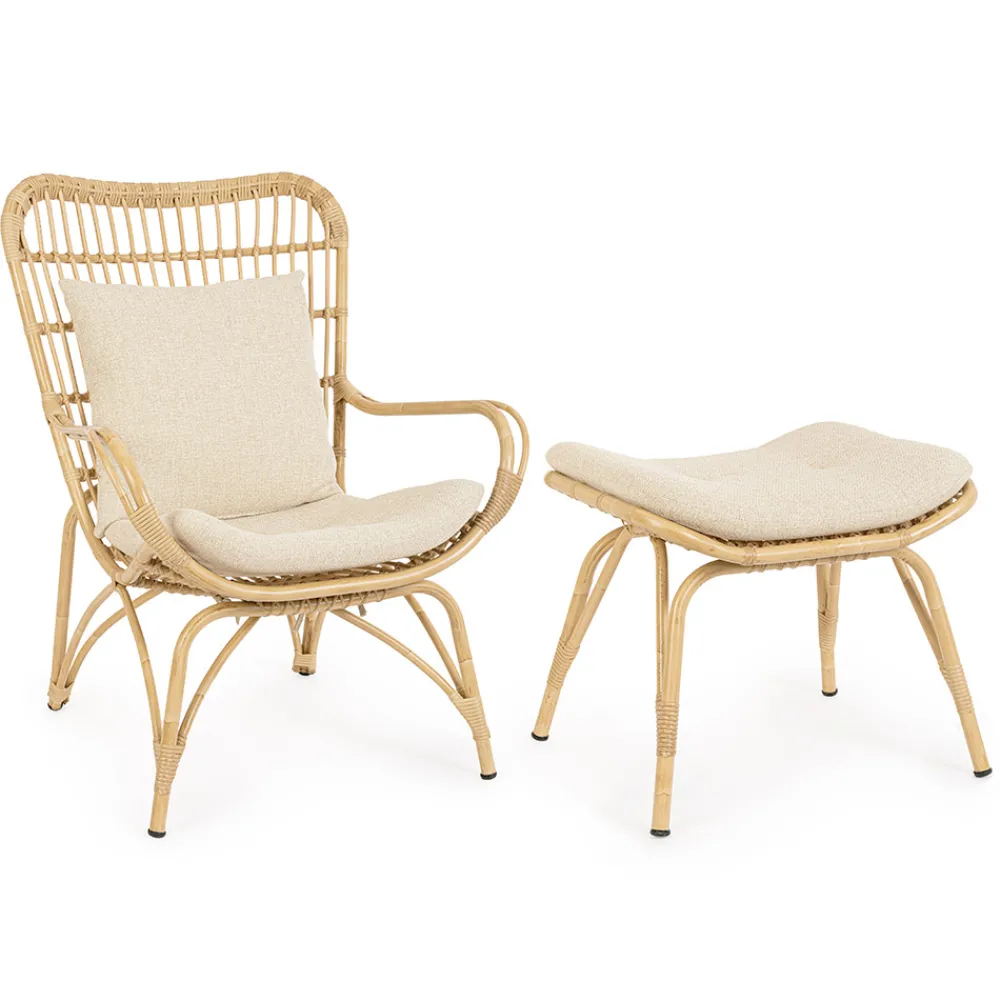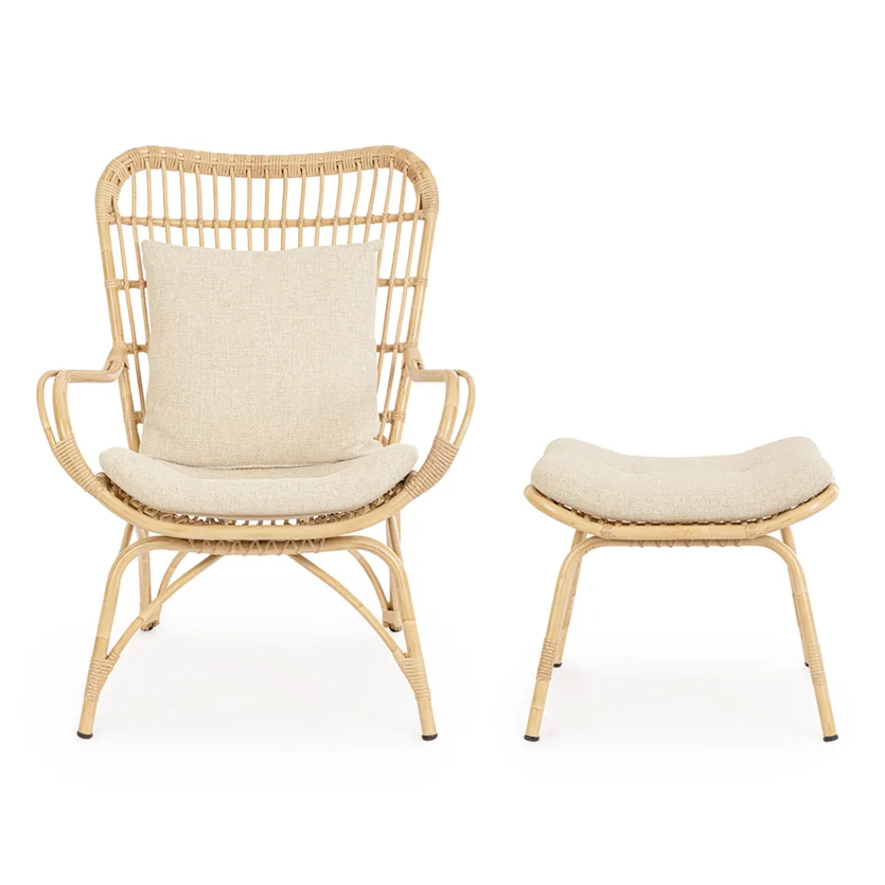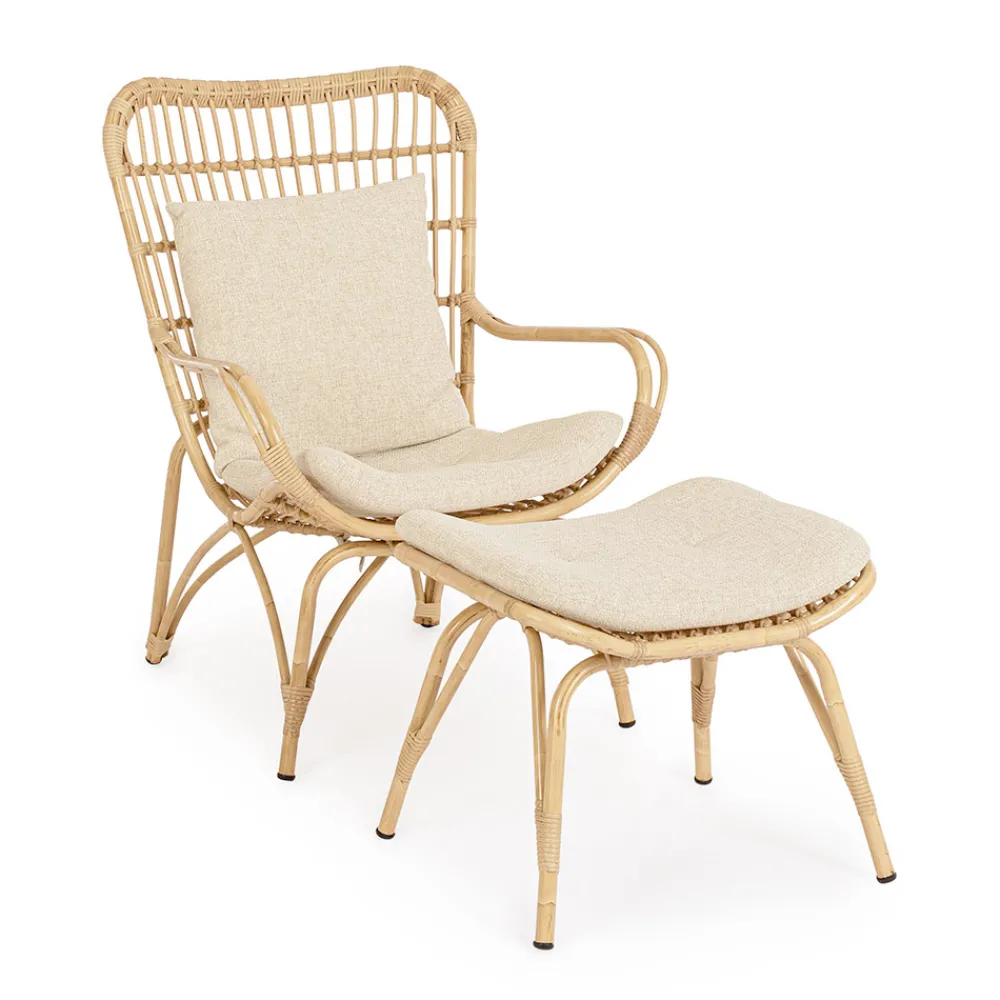 Dieser Gartensessel mit Fußhocker ist die perfekte Synthese aus Eleganz und Komfort . Es besteht aus hochwertigen Materialien und ist für diejenigen konzipiert, die auch im Freien nicht auf Stil verzichten möchten. Seine gewebte Rattan-Effektstruktur gewährleistet nicht nur Haltbarkeit und Witterungsbeständigkeit , sondern bietet auch ein natürliches Erscheinungsbild, das sich harmonisch in die äußere Umgebung einfügt. Die Stoffkissen bieten unvergleichlichen Komfort und laden zu Momenten purer Entspannung unter freiem Himmel ein. Die Fußstütze, die den weichen und einladenden Linien des Sessels folgt, rundet das Entspannungserlebnis ab und ermöglicht es Ihnen, Ihre Beine auszustrecken und den Garten in aller Ruhe zu genießen. Dieser Sessel ist nicht nur ein Möbelstück, sondern eine wahre Wohlfühloase , perfekt, um die kühlen Sommerabende oder die warmen Strahlen der Frühlingssonne zu genießen.