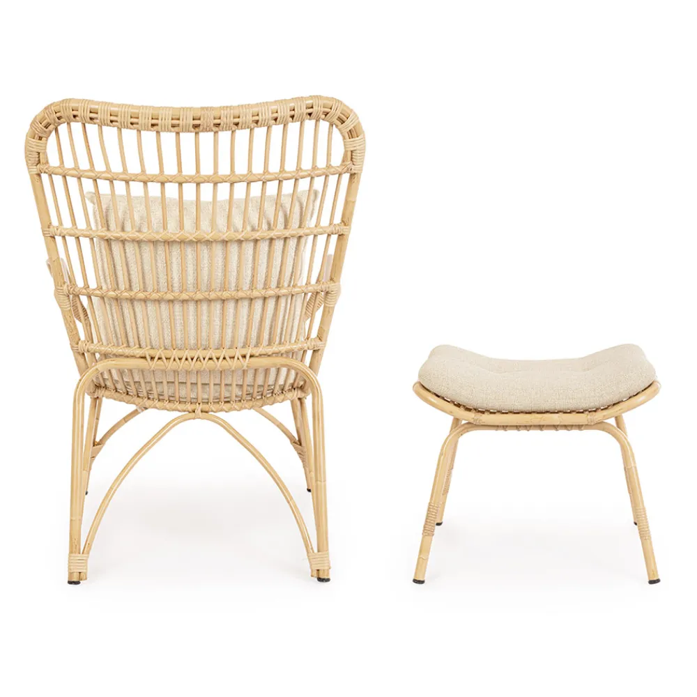 Sessel mit Fußstütze aus pulverbeschichtetem Aluminium mit Rattan-Effekt.