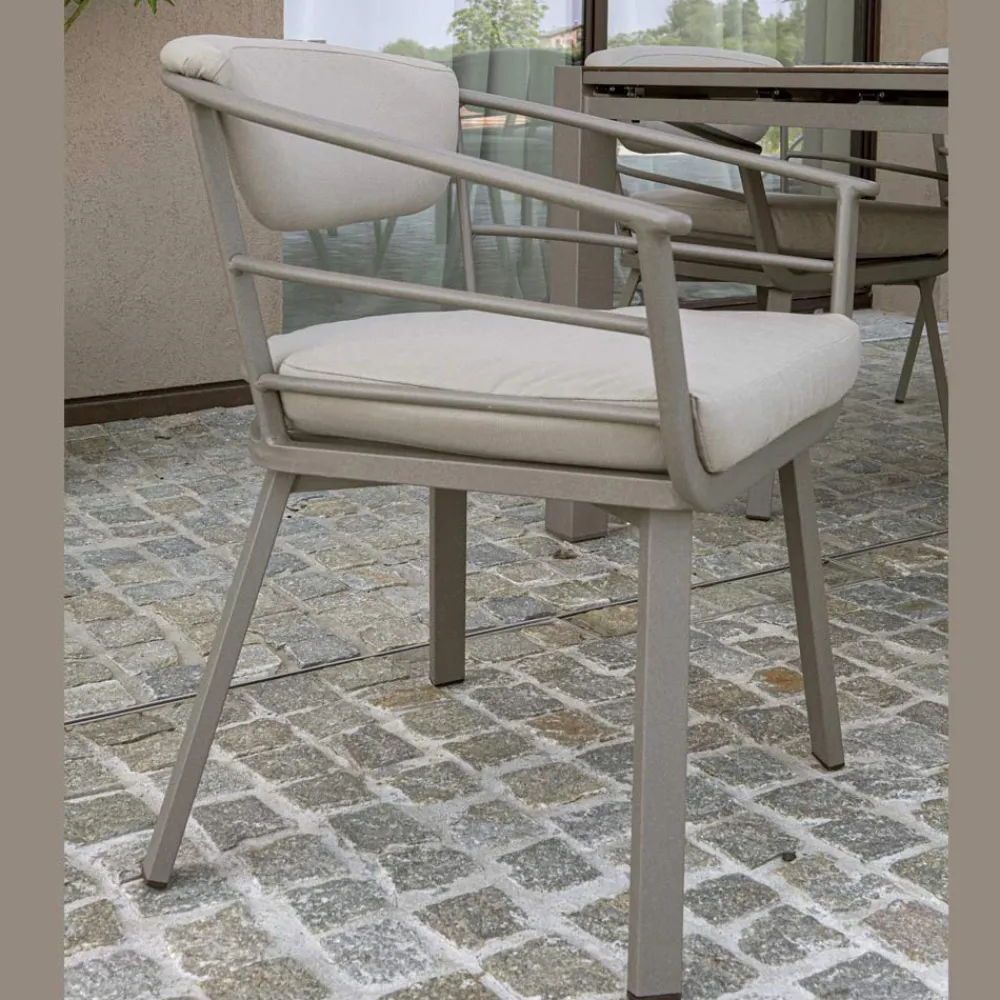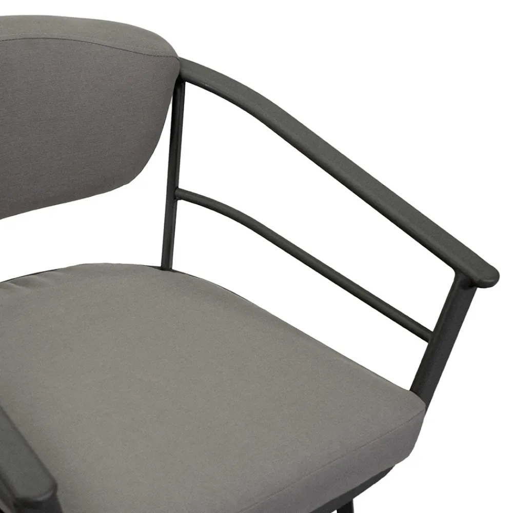 Outdoor-Sessel mit taubengrauem pulverbeschichtetem Aluminiumrahmen und taubengrauen Sitz- und Rückenkissen aus 100% wasserabweisendem Polyester, 8 cm dick.