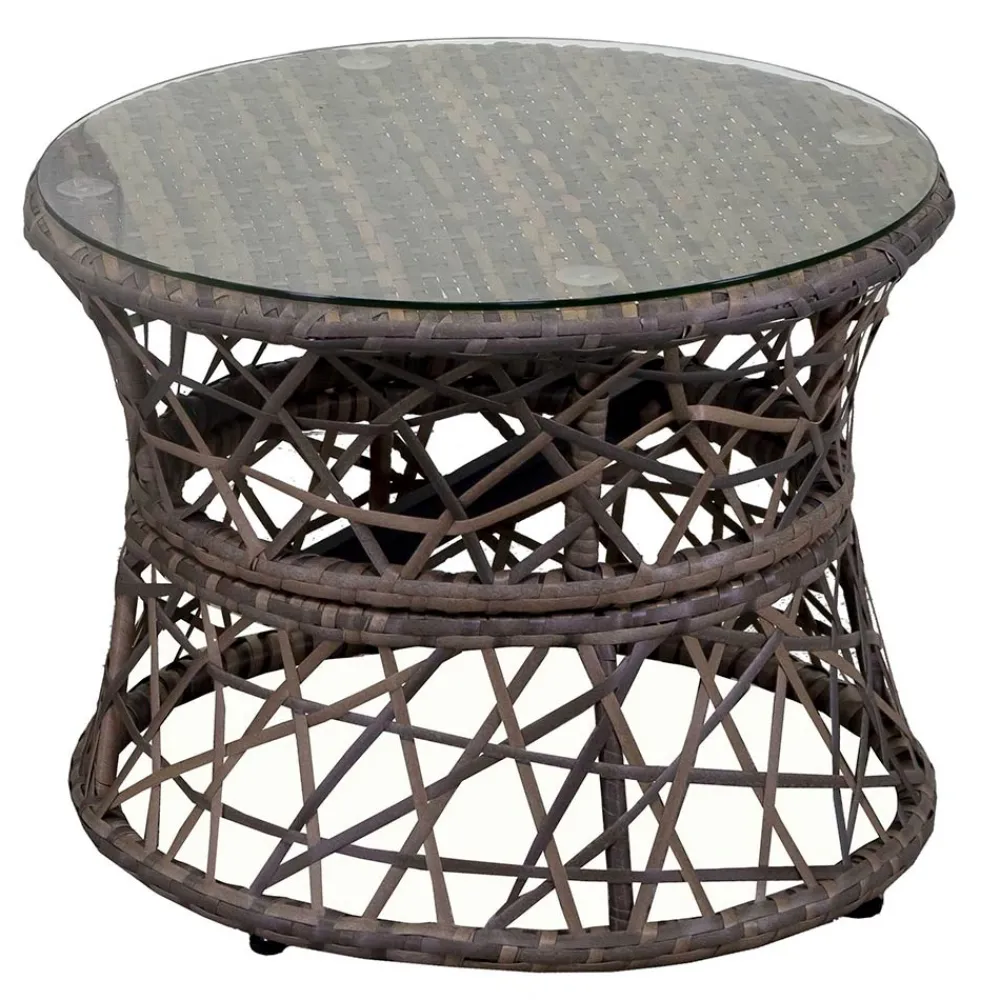 Der passende Kaffeetisch verfügt über eine Glasplatte, ideal um Getränke, Bücher oder Dekorationen in Reichweite zu halten. Seine runde Form und kompakte Größe machen ihn vielseitig einsetzbar und leicht neben dem Sessel oder in jeder Ecke des Gartens oder der Terrasse zu platzieren.