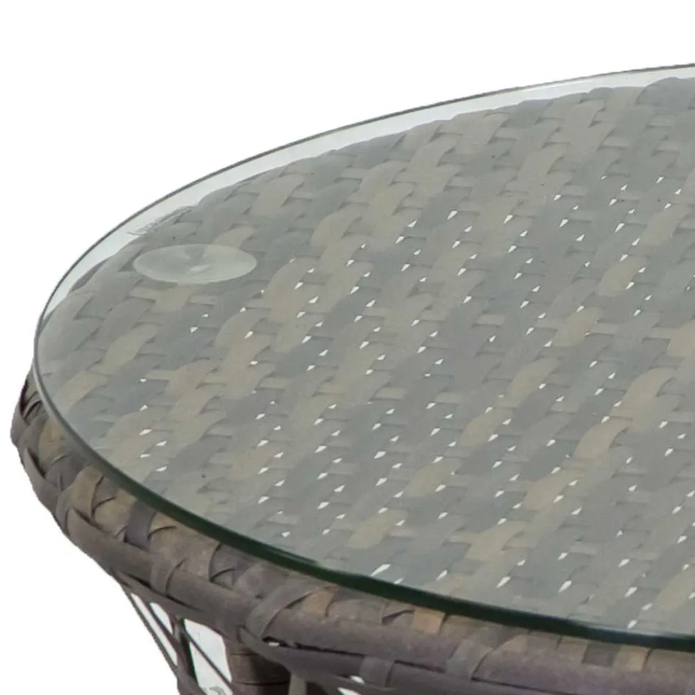 Ebenfalls enthalten ist der Couchtisch mit einem Aluminiumrahmen mit rundem Polyrattanbezug und einer 5 mm gehärteten Glasplatte.