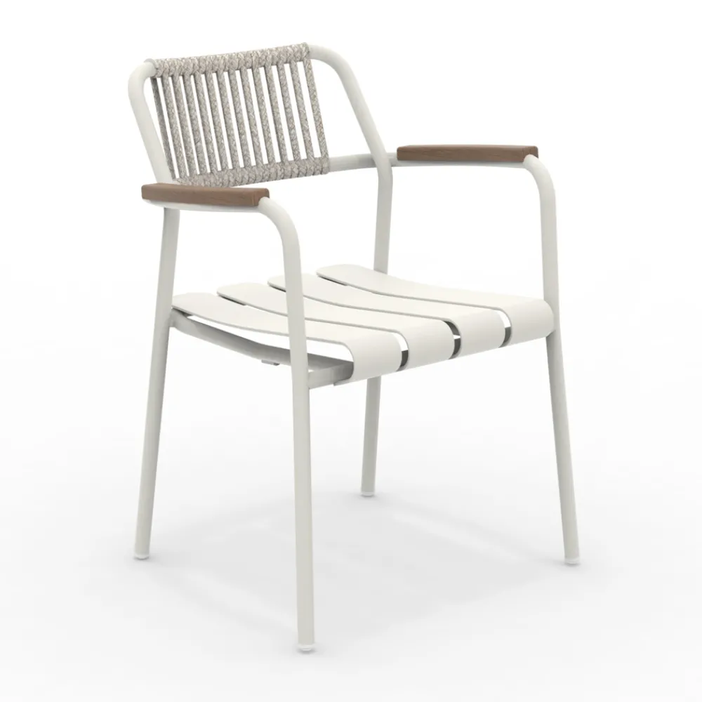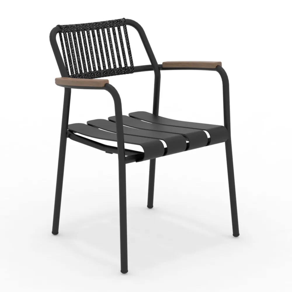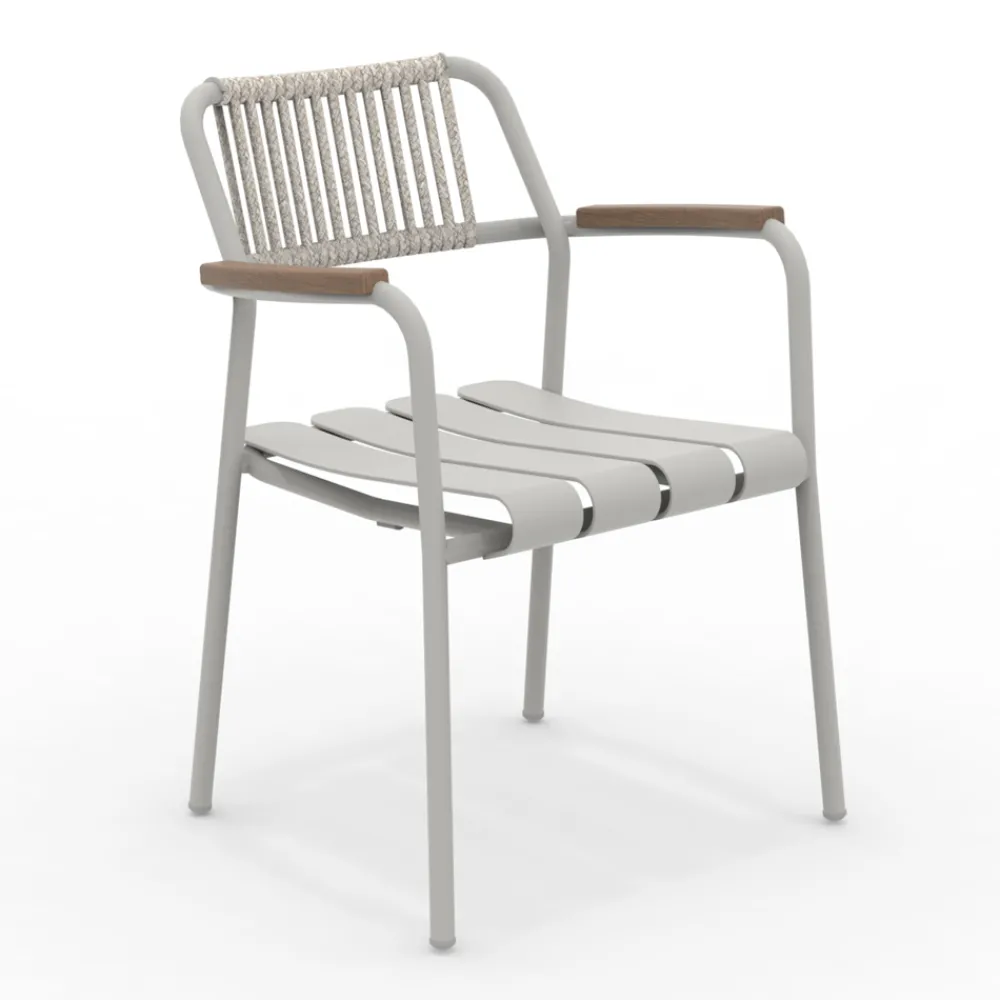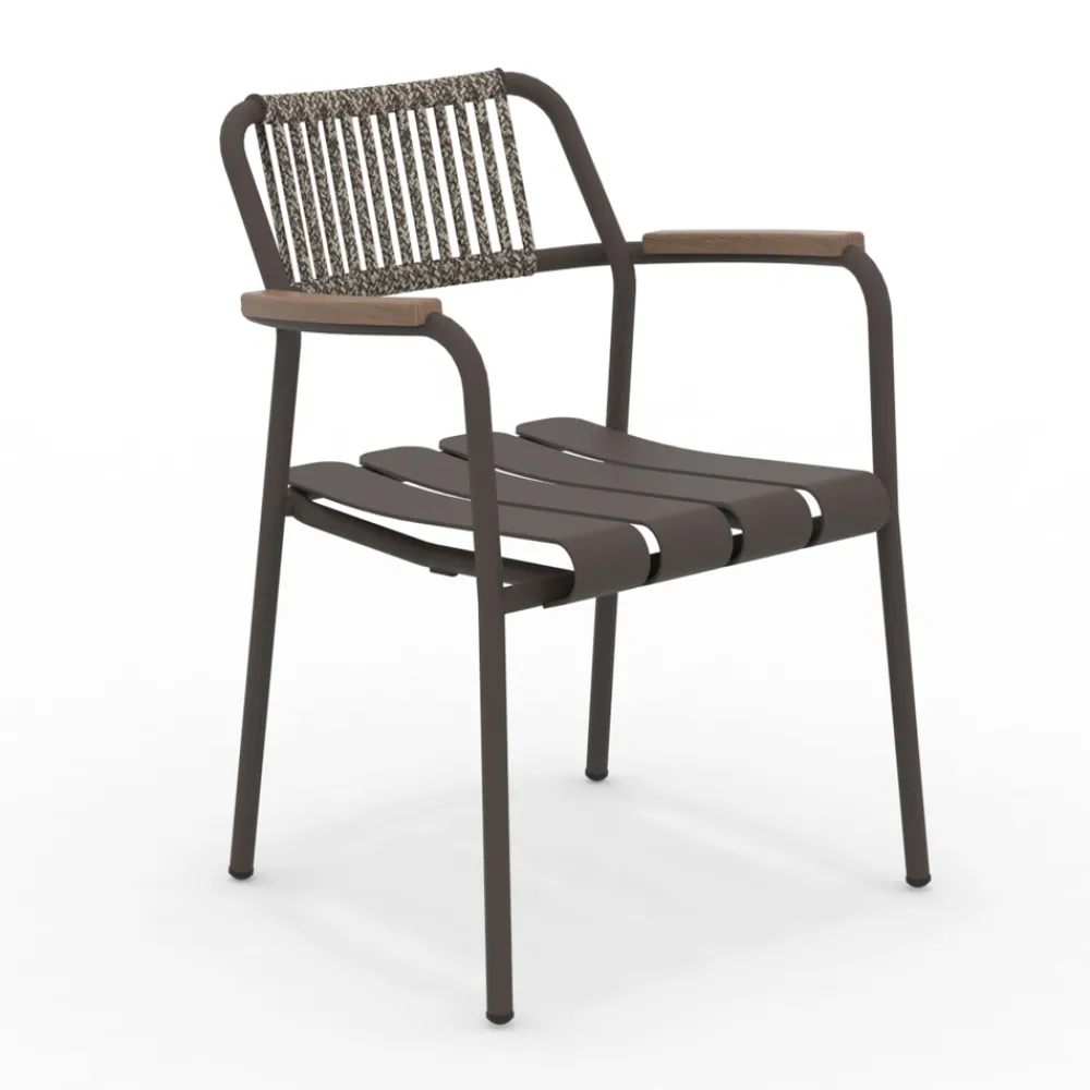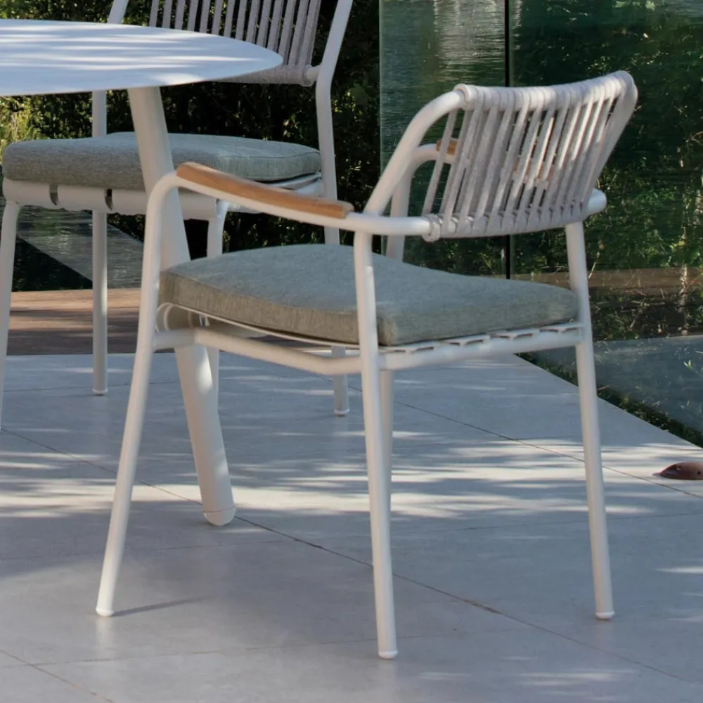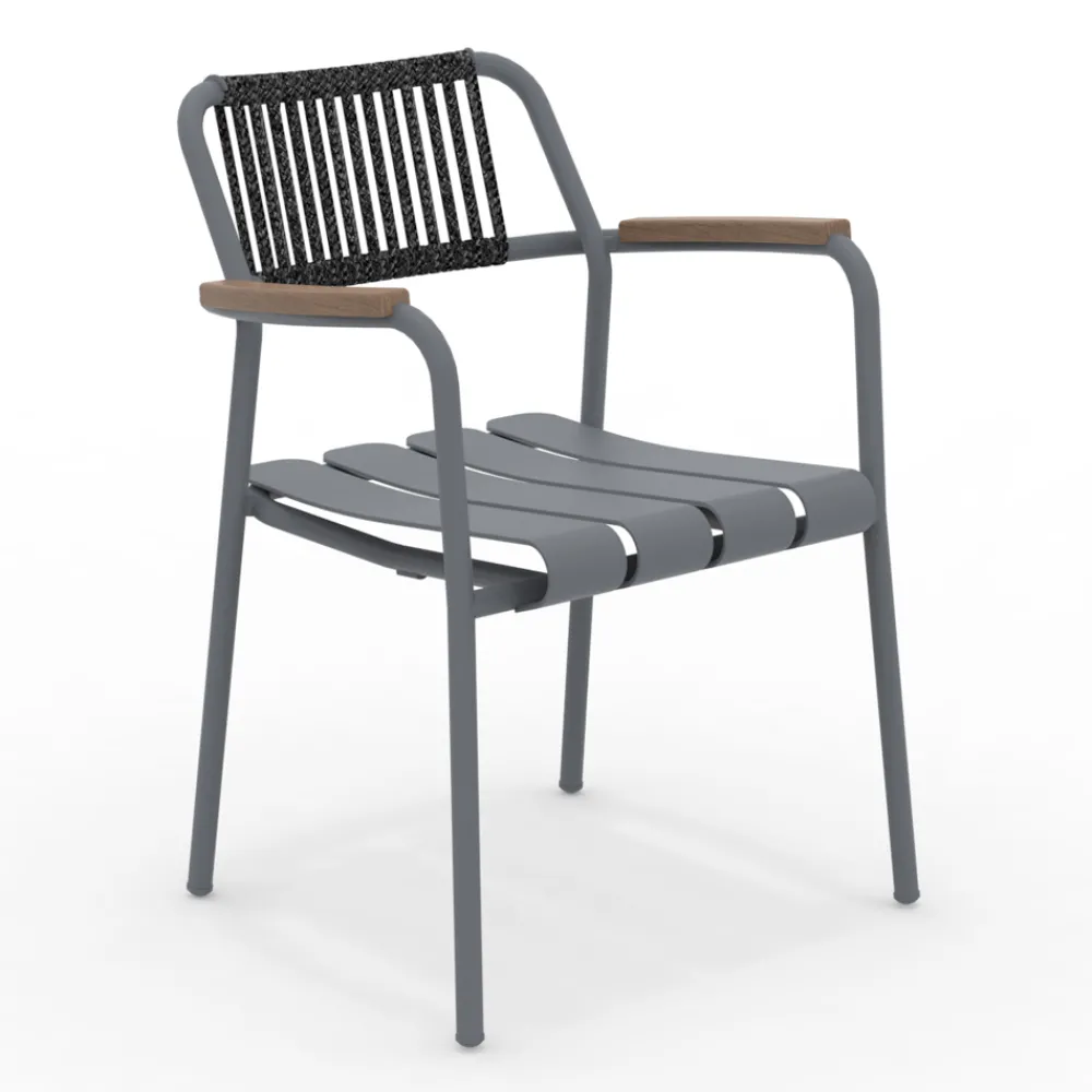 2 Outdoor-Sessel mit Aluminiumrahmen, Armlehnen aus FSC-Teakholz und Seilrückenlehne.