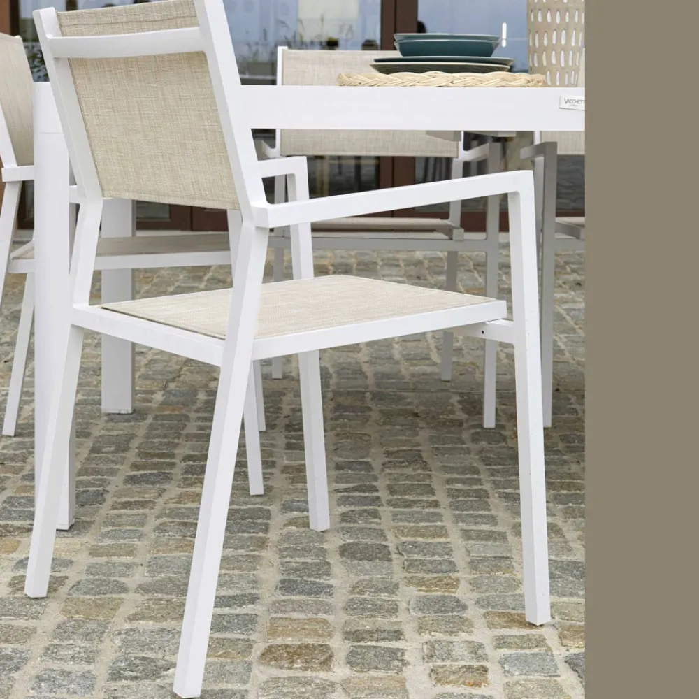 Sessel mit einer Struktur aus mattweißem Aluminium und einer Sitzfläche aus beigem Textilene gr560/m2, Stärke 2×1.