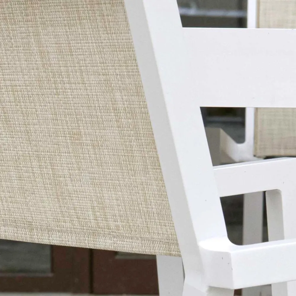 Die robuste Struktur aus mattweißem Aluminium garantiert Langlebigkeit und Widerstandsfähigkeit gegen die Elemente und behält seine Schönheit im Laufe der Zeit. Der beige Textilene Bezug verleiht nicht nur einen Hauch von Klasse mit seiner raffinierten Textur, sondern bietet auch einen unschlagbaren Komfort dank seiner Elastizität und Atmungsaktivität.