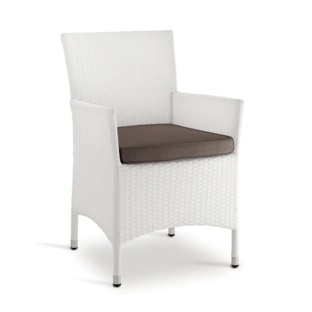 Gartensessel mit einem Aluminiumrahmen, der mit weißem Korbgeflecht bezogen ist, und einem Sitzkissen aus mokkafarbenem Stoff.