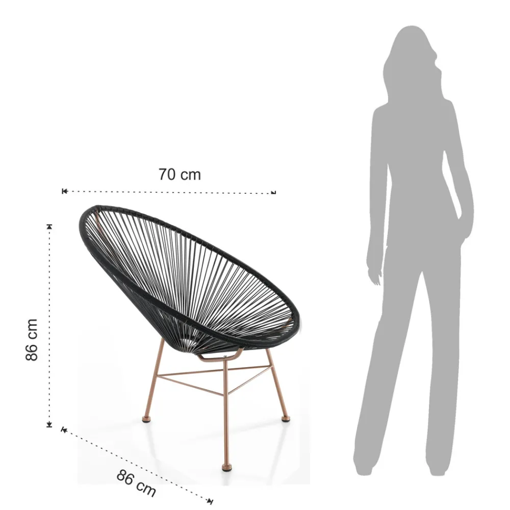 Sessel mit halbglänzend kupferlackiertem Metallgestell und Rückenlehne aus schwarzem Polyrattan-Kordel, komplett aus Metall .