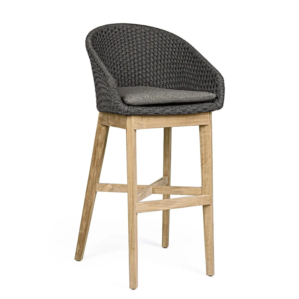Hochwertiger Außenhocker aus Teak und Seil mit abnehmbarem Stoffkissen, 2 Stück.