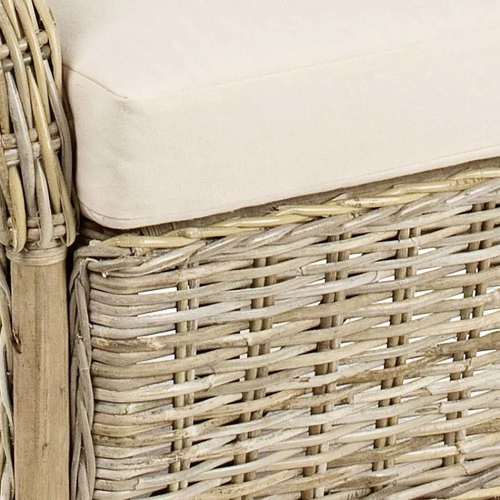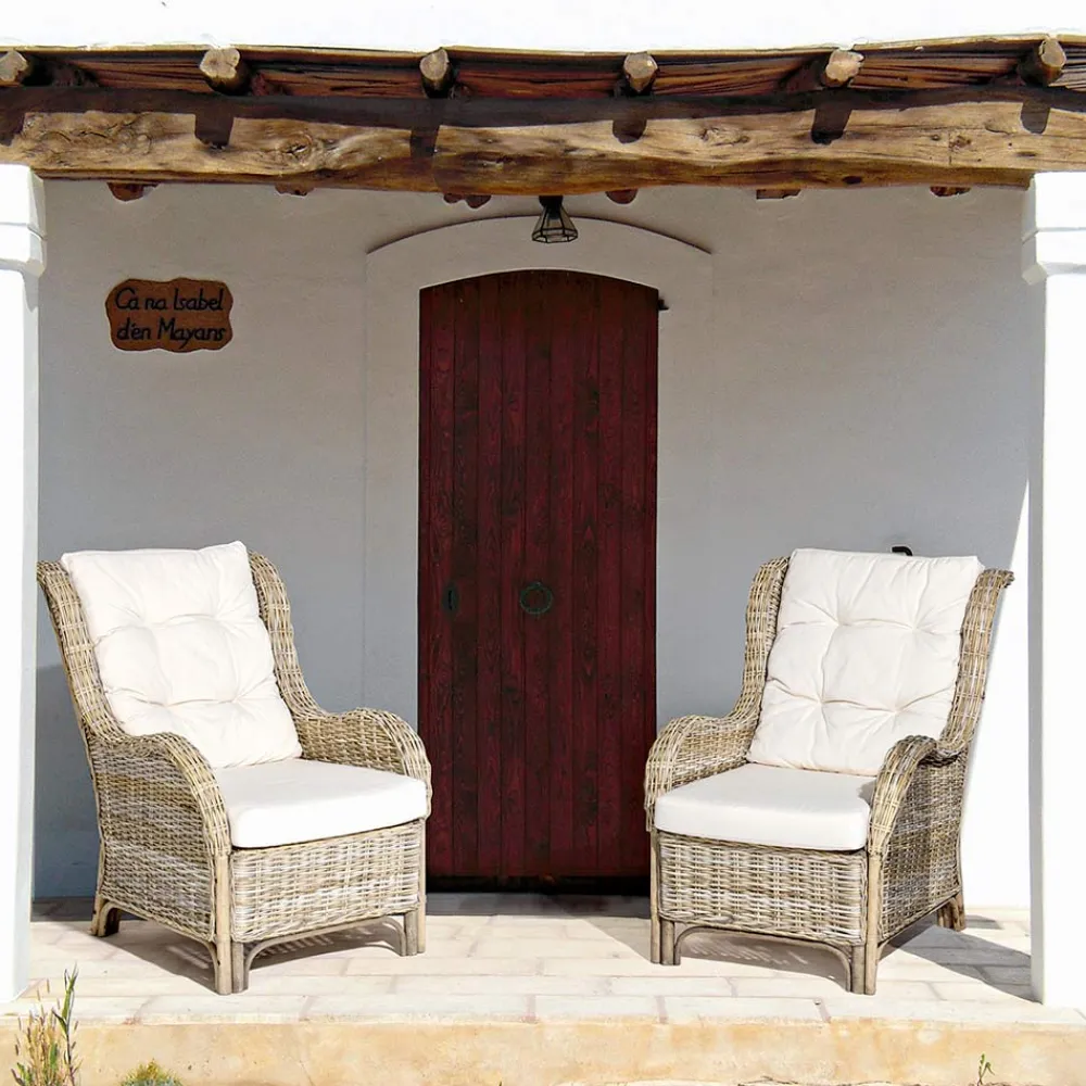 Garten-Design-Sessel aus natürlichem Rattan für den Außenbereich, ausgestattet mit Kissen.