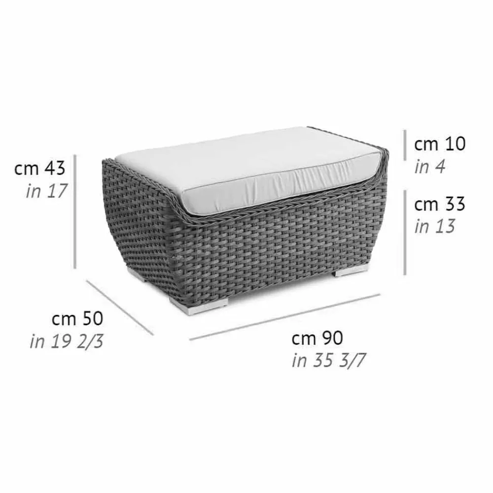 Hocker für den Garten aus feinem, luxuriös gewebtem synthetischem Rattan und weißem oder Ecru-Kissen.