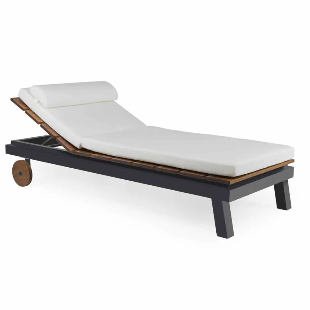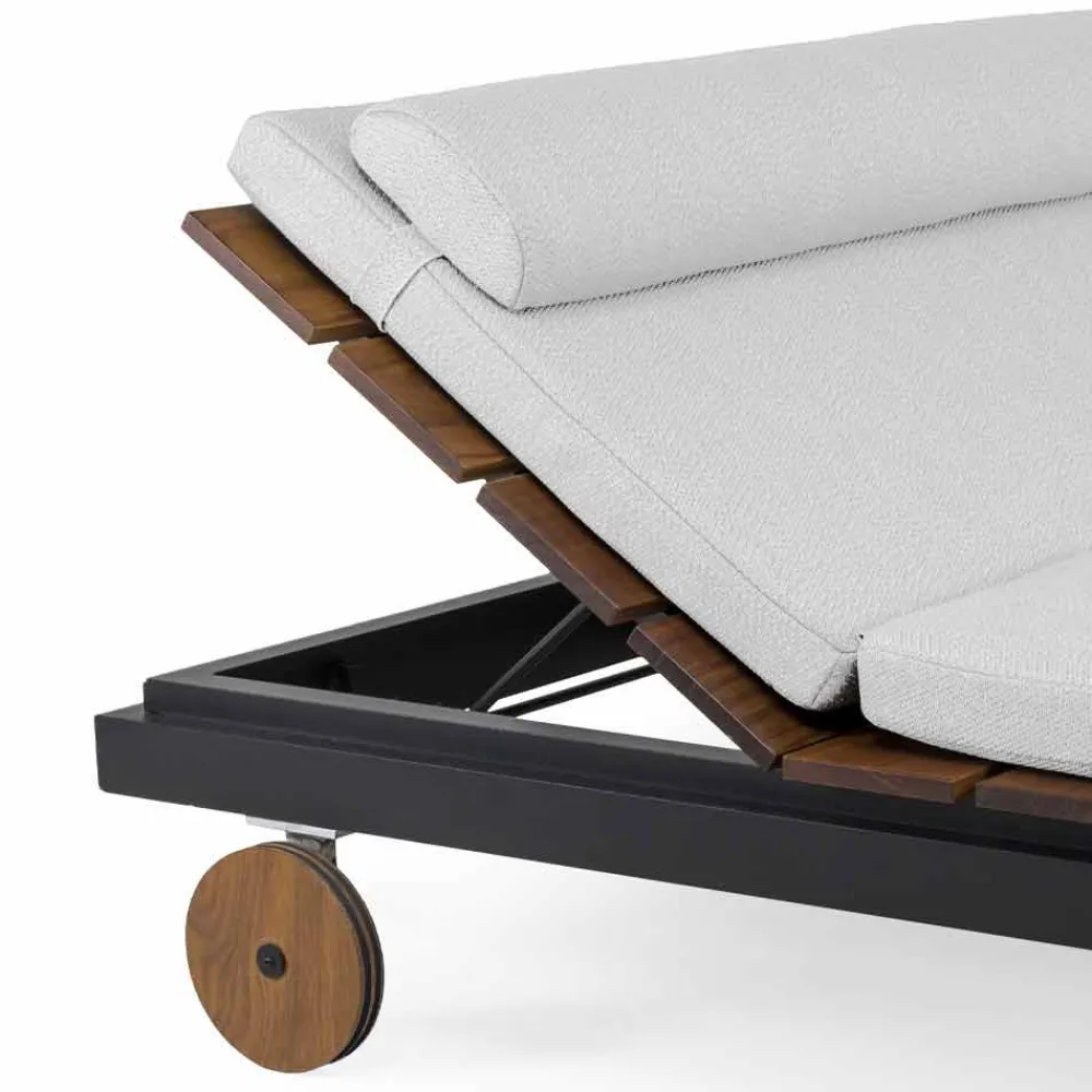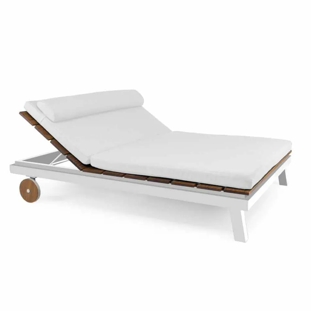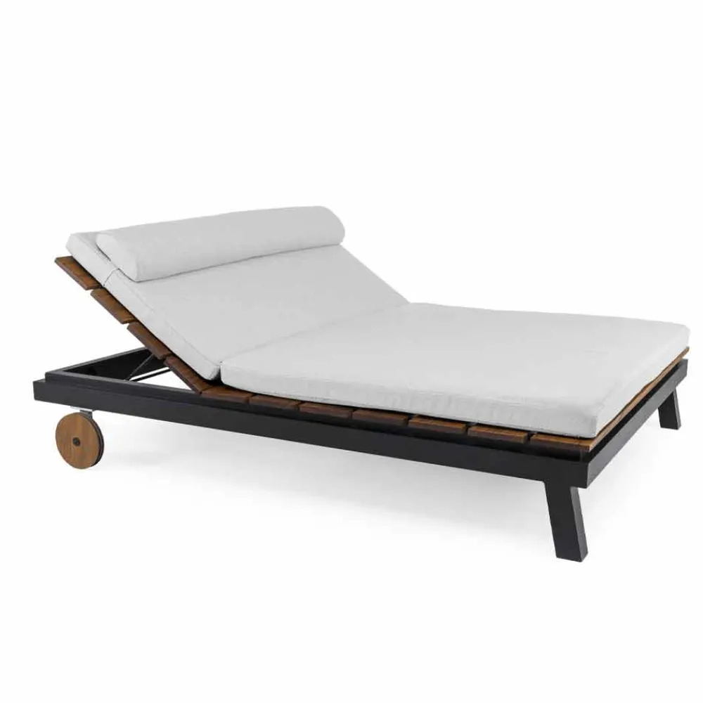 Gartenliege im Einzel- oder Doppeldesign aus weißem oder schwarzem Aluminium, Holzlatten sowie Rädern und Kissen.