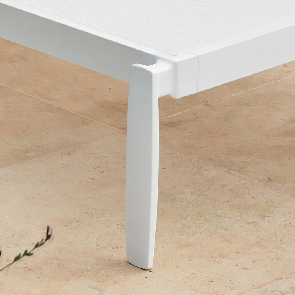 Es ist das Detail des Beines aus Aluminiumguss , das dieser Sonnenliege das raffinierte Design verleiht, das sie auszeichnet und in ihrer formalen Gelassenheit personalisiert.