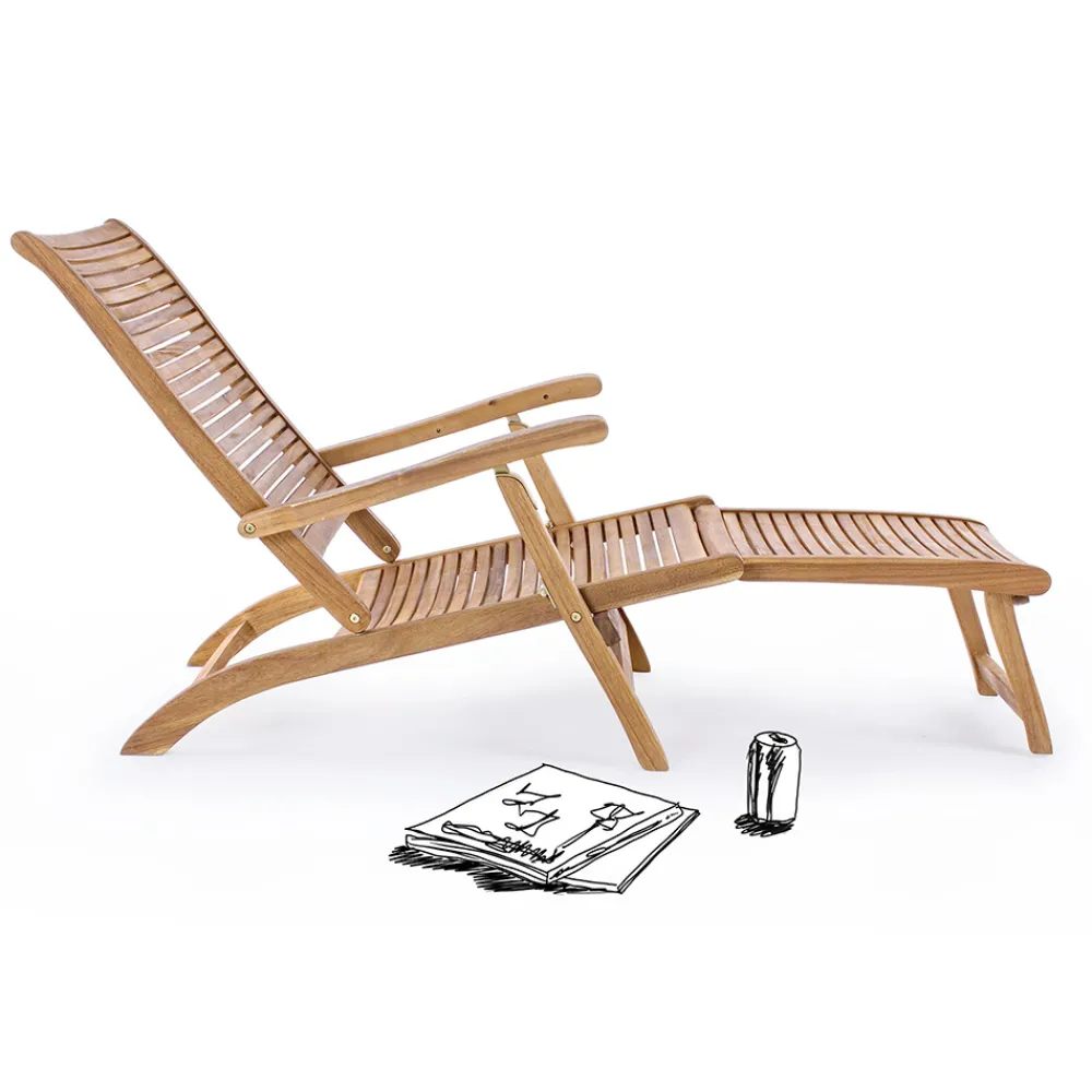 Garten Chaiselongue Sessel aus Naturholz und bequem liegend.