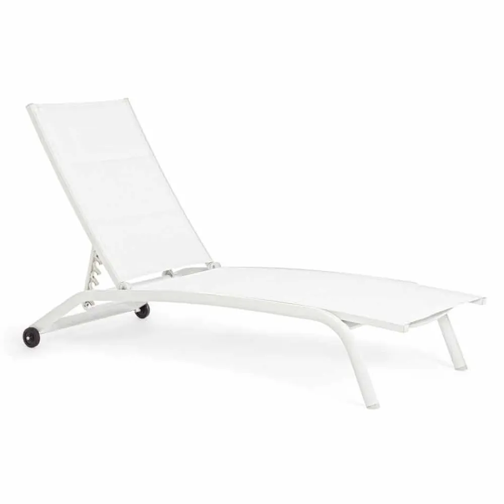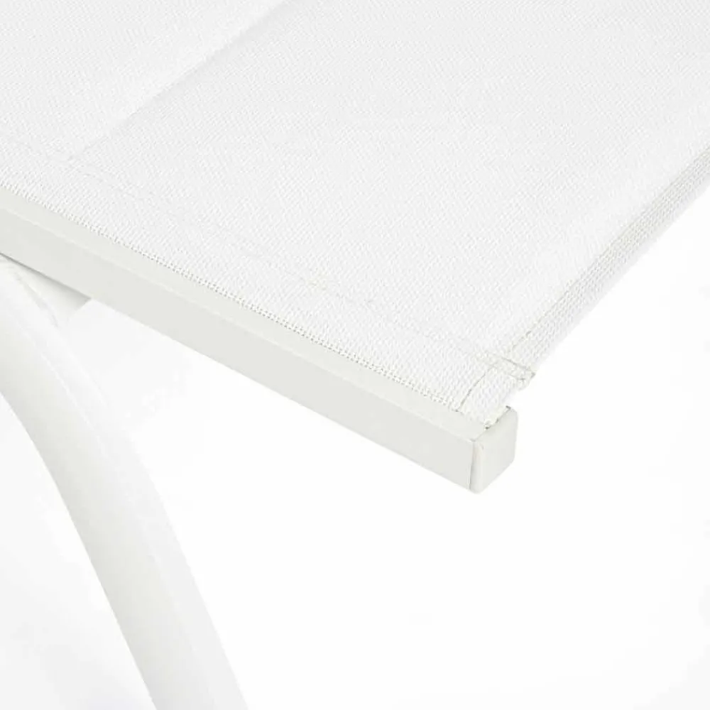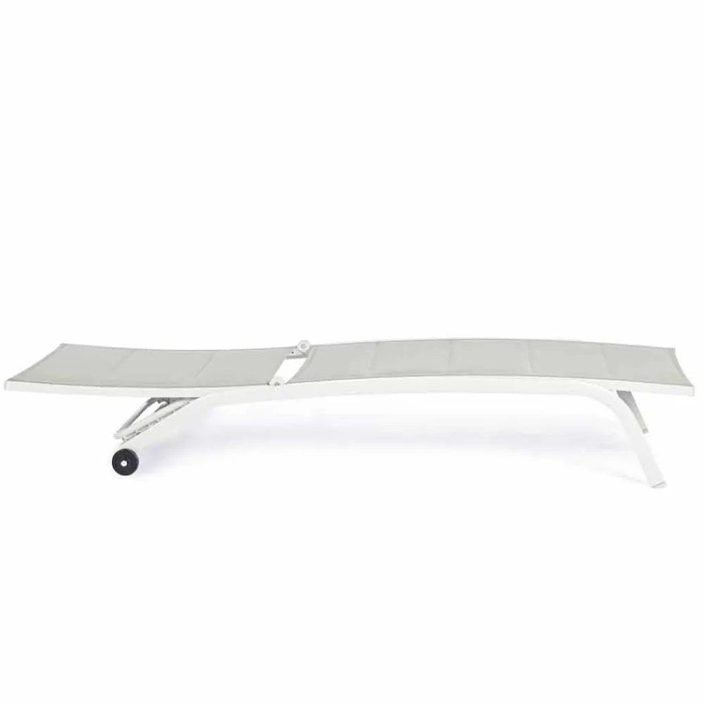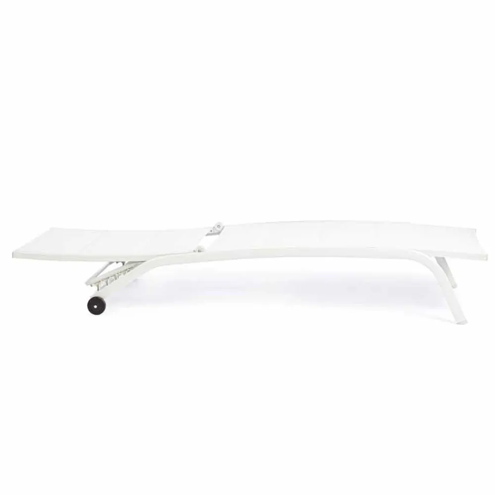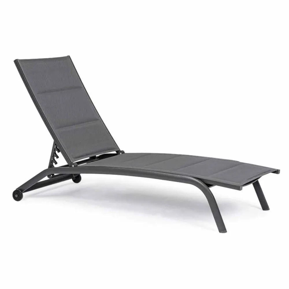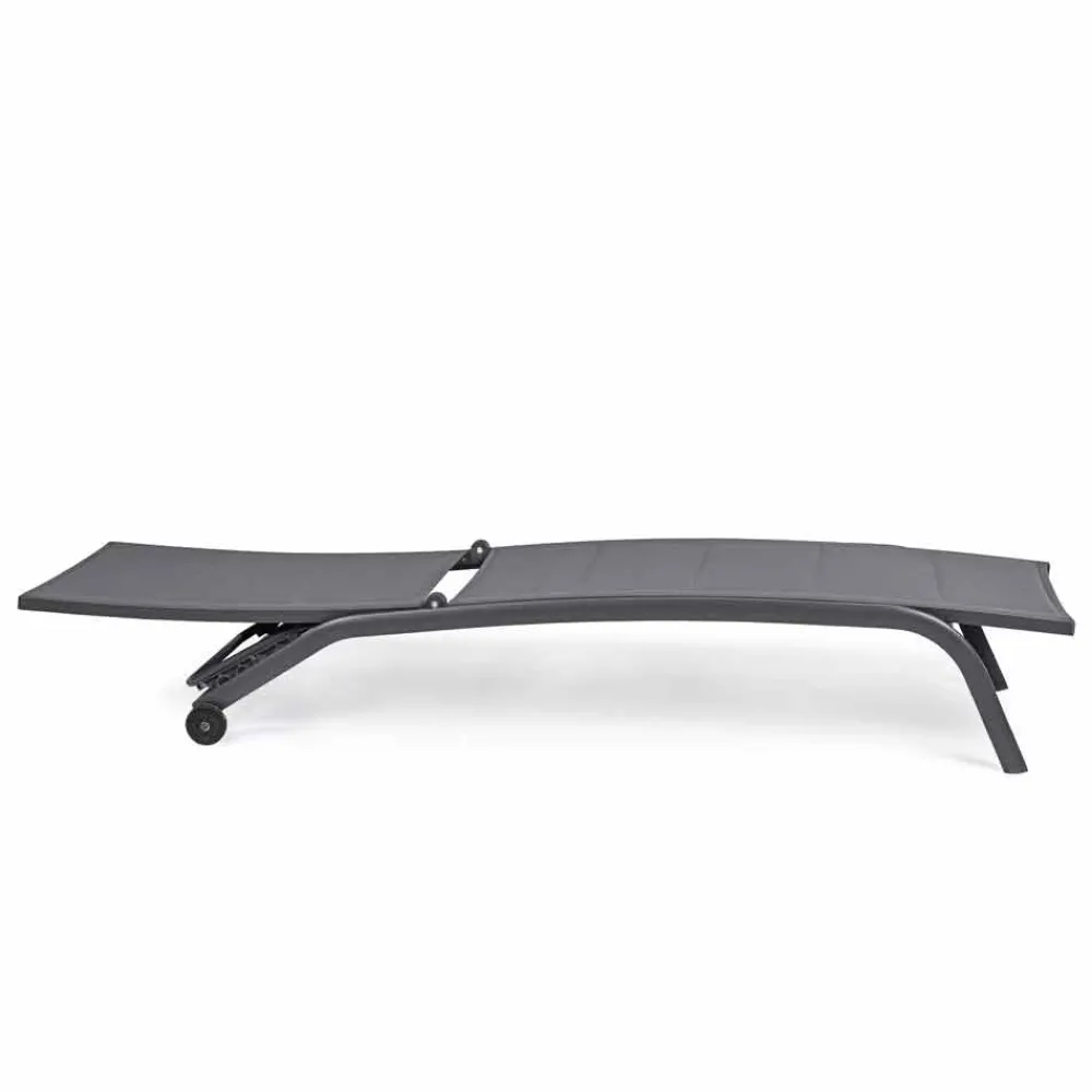 Pulverbeschichtete Aluminiumstruktur (Polyester). 2×1 Textilienhülle (mit Polsterung). 5-Positionen-Rückenlehne. Kunststoffräder.